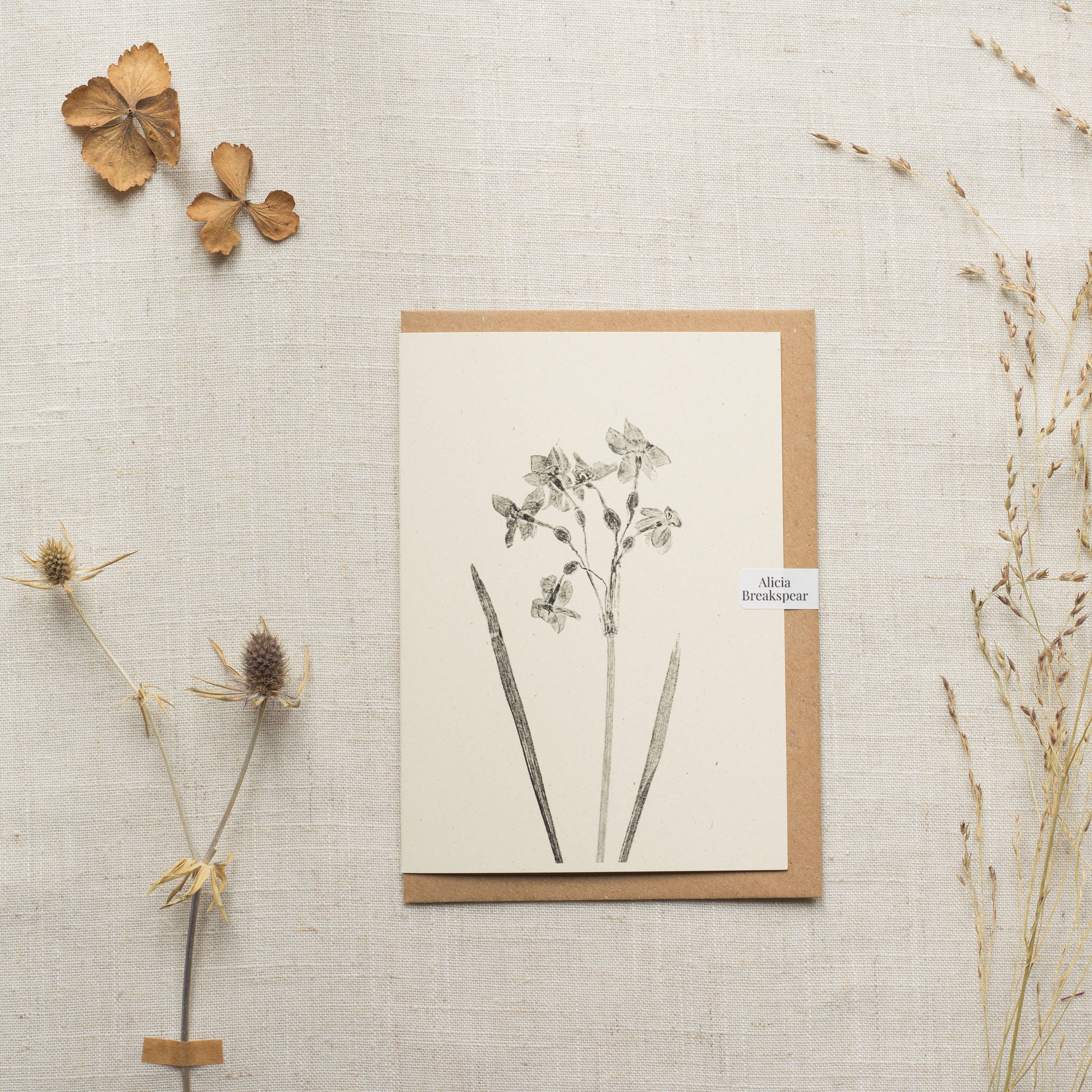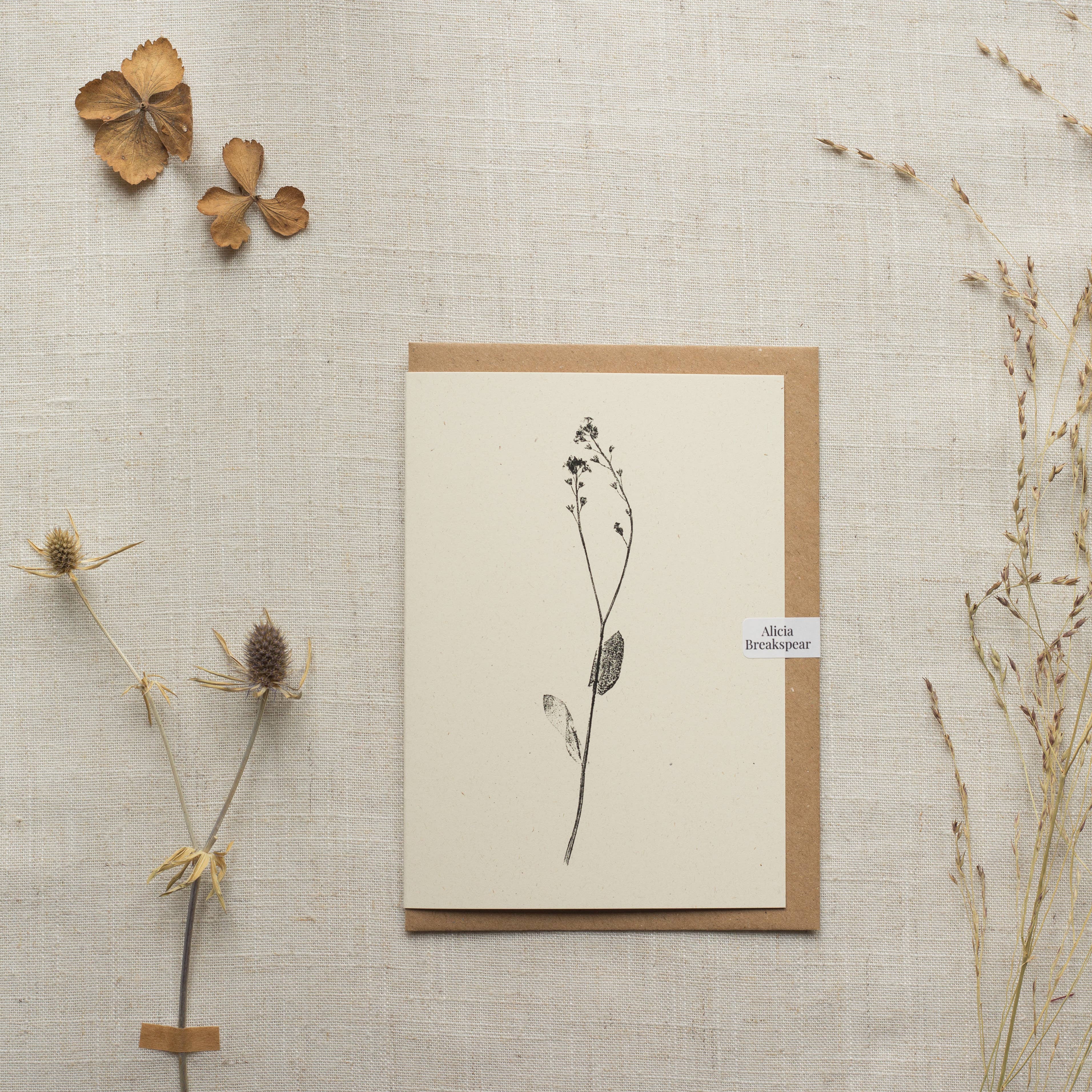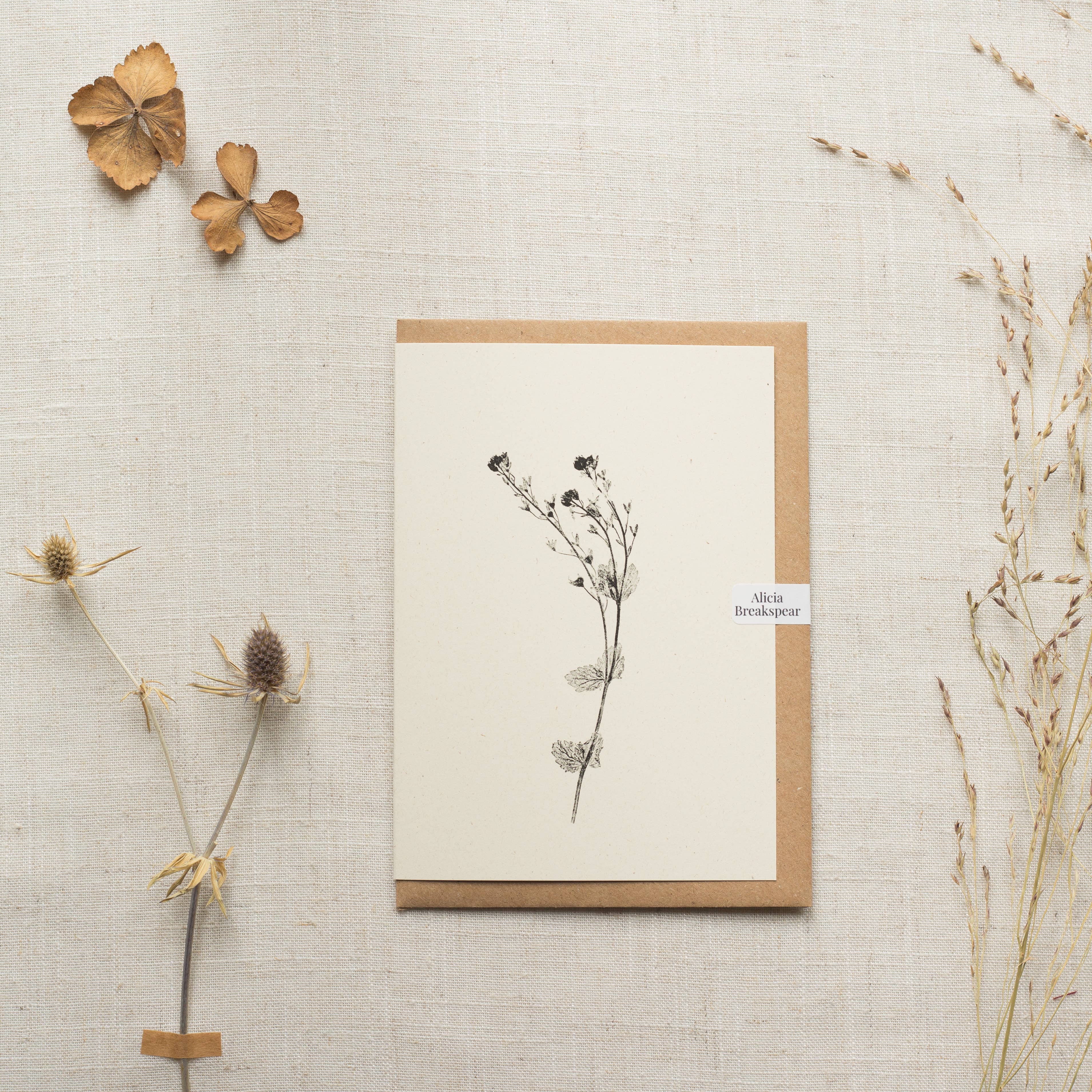 An elegant and timeless greeting card featuring the Lady's Smock flower also called Cuckoo flower. Created by Alicia's unique process of printmaking with plants. - A6 Greeting Card - 260gsm 80% recycled card stock - 100% recycled Kraft envelope - Ivory colour card - Blank inside - Plant name featured on the back of the card - Plastic free - comes with an easy peel sticker clasp instead of plastic sleeves. - Biodegradable sleeve are available on request, sticker is standard. The card is perfect all year round due to not being related to a specific holiday, so it suitable for a range of reasons. Just because, happy birthday, sorry for your loss, happy anniversary, happy new home... Cards come in packs of 6 to be sold individually. These cards have a vintage, rustic, minimalist, scandi style to them. The simplistic black ink on ivory card evokes a sense of calmness, serenity and elegance. Customers often frame the cards in groups and take great pride in curating sets to hang on the wall. So, the cards can double up as small art prints for your customers. This can be encouraged in your store by framing a few yourself, to show the customer how their recipient or themselves can cherish the card.