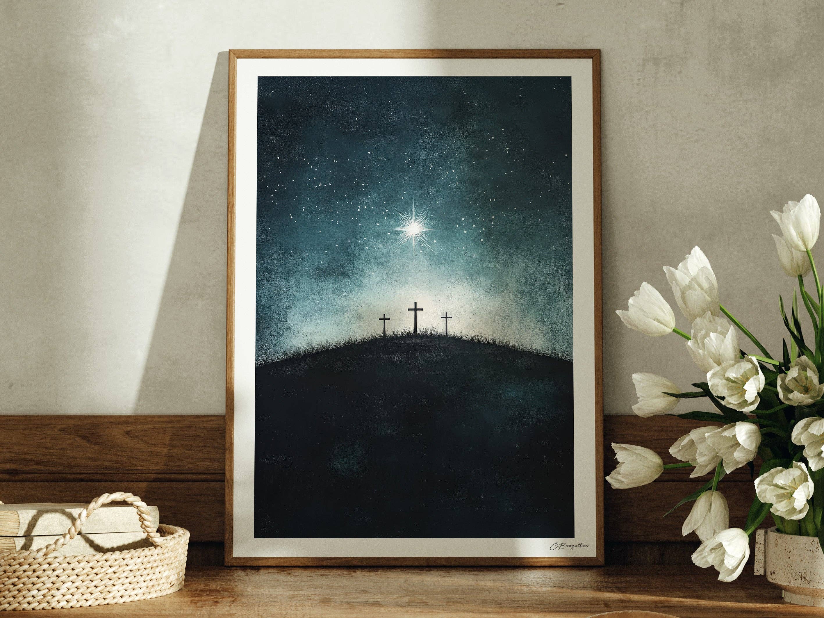 From my studio to your home, these prints are a testament to the beauty and depth of the gospel of Jesus Christ. Utilizing the highest quality Giclee printing process with acid-free archival inks on museum-grade fine art paper, these prints capture the essence of each painting with stunning clarity and color depth. I handmake and sign each piece, reflecting my commitment to bring you timeless and affordable Christ-centered art. These unframed art prints are available in four sizes from 5x7 to 16x20 inches and ready for you to personalize with your favorite frame, allowing you to match any style of décor. Have you ever stood beneath the night sky and felt awe at the majesty of God’s creation? “To whom will you compare me? Or who is my equal?” says the Holy One. Lift up your eyes and look to the heavens.” (Isaiah 40:25-26) This painting was inspired by those verses, symbolizing the wonder and awe that naturally flows from contemplating our Creator.