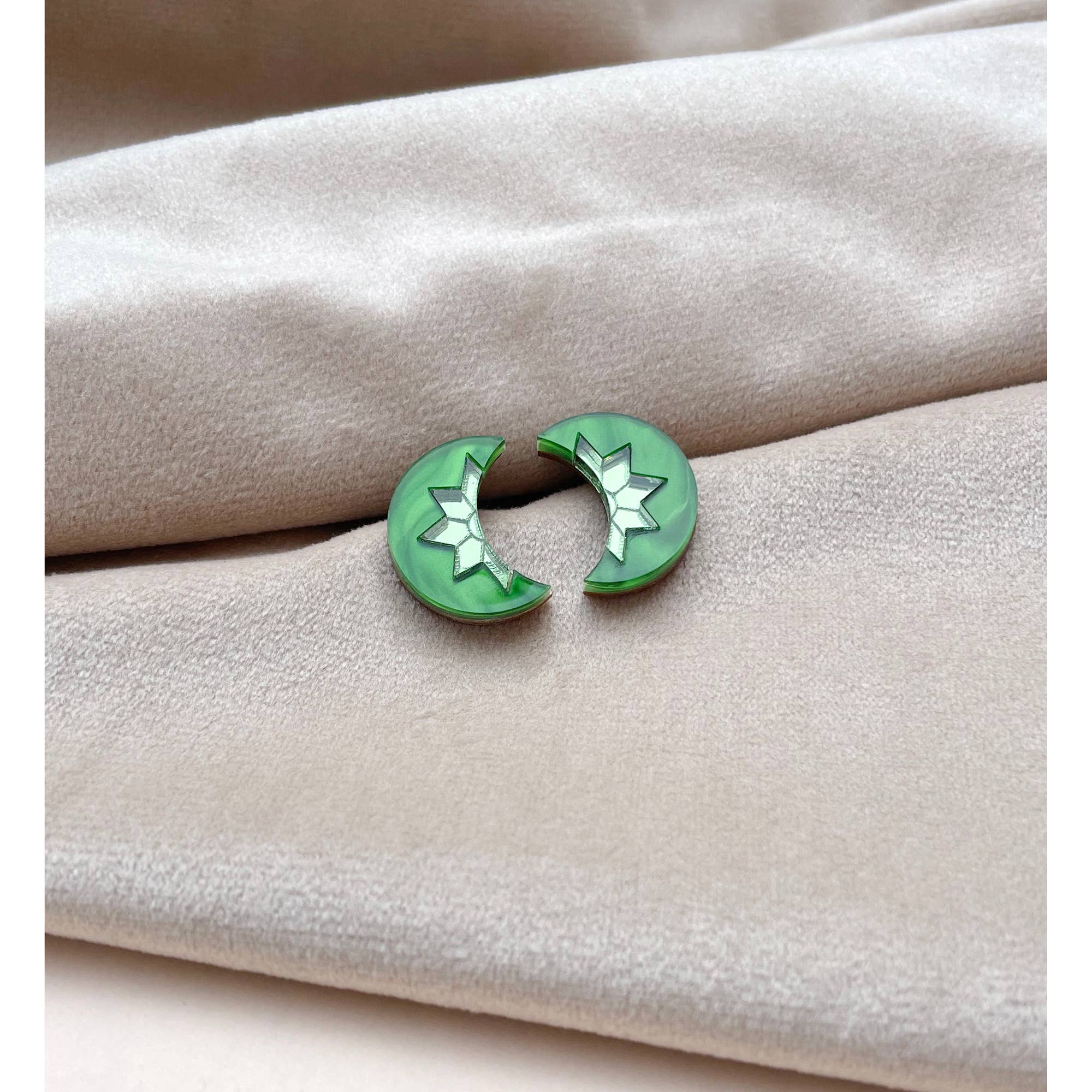 - Aurora Mini Moon Stud Earrings in Slate Marble & Gold - These Aurora Mini Moon Stud Earrings are inspired by a mix of Art Deco design and vintage celestial motifs. Ideal for festive parties, or just to cheer yourself up on a dark winter's day, these earrings are the perfect way to add a little pop of colour and sparkle. As usual, I couldn't stop at just one colour combination, so there are five to choose from! The earrings are laser-cut from various acrylic colours and finishes, with plenty of laser-engraved and etched detailing. The earring studs are made from surgical steel, ideal for sensitive ears, and are presented on a custom made arch-shaped earring card.