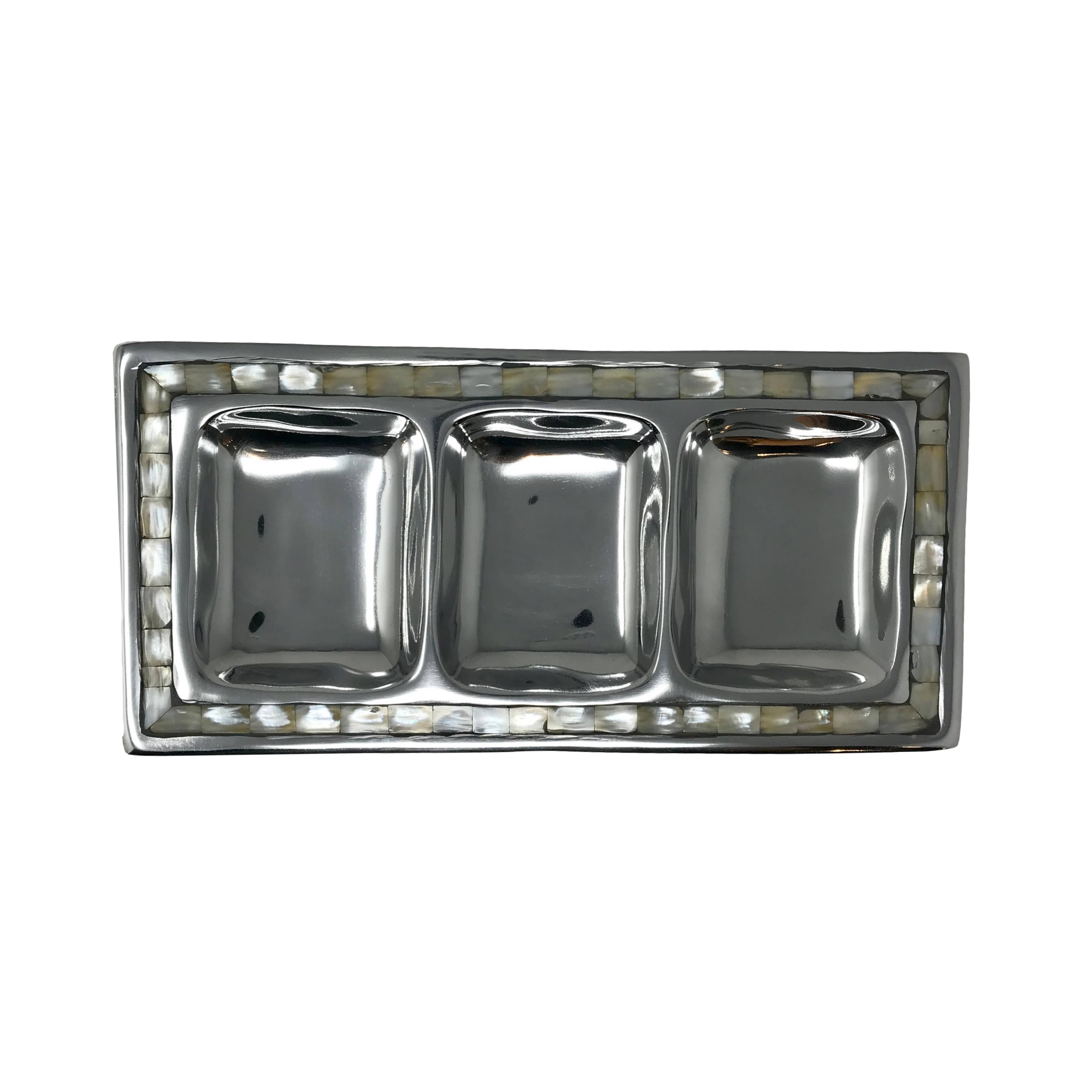Polished Cast Aluminum Round Charcuterie Serving Tray with Mother Of Pearl Inlay. The Mother Of Pearl Shell is hand-cut and assembled as a border worthy of your finest foods! Food Safe. Perfect Condiment Dish for Elegant Dining & Coastal Living! Halloween, Thanksgiving and Christmas Decor