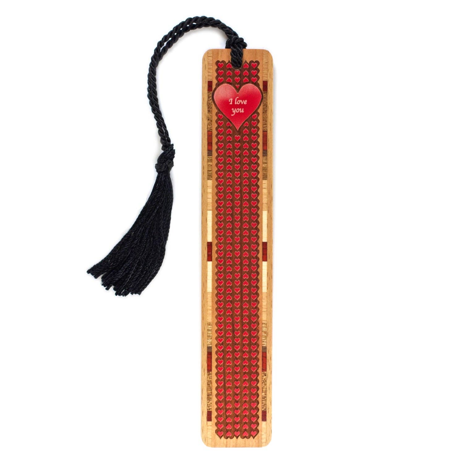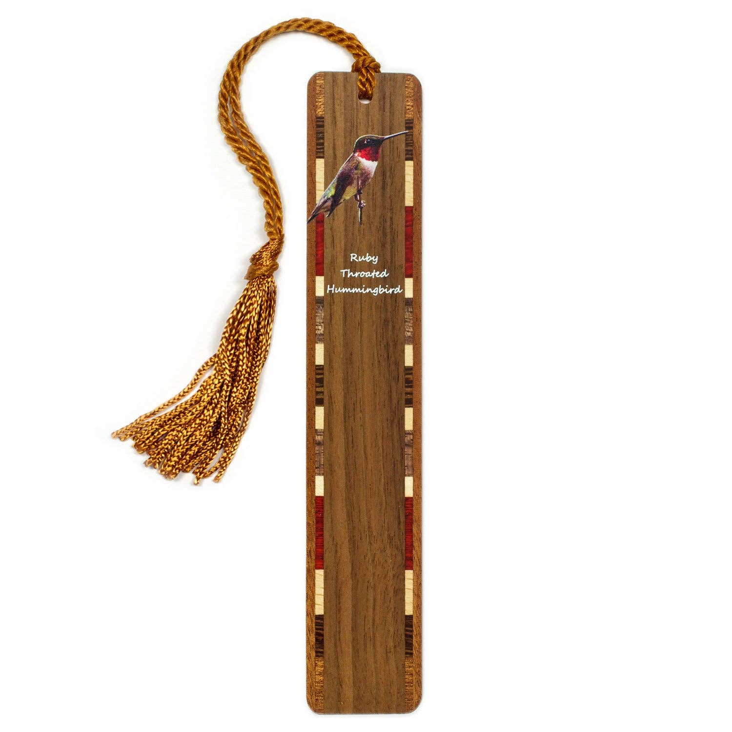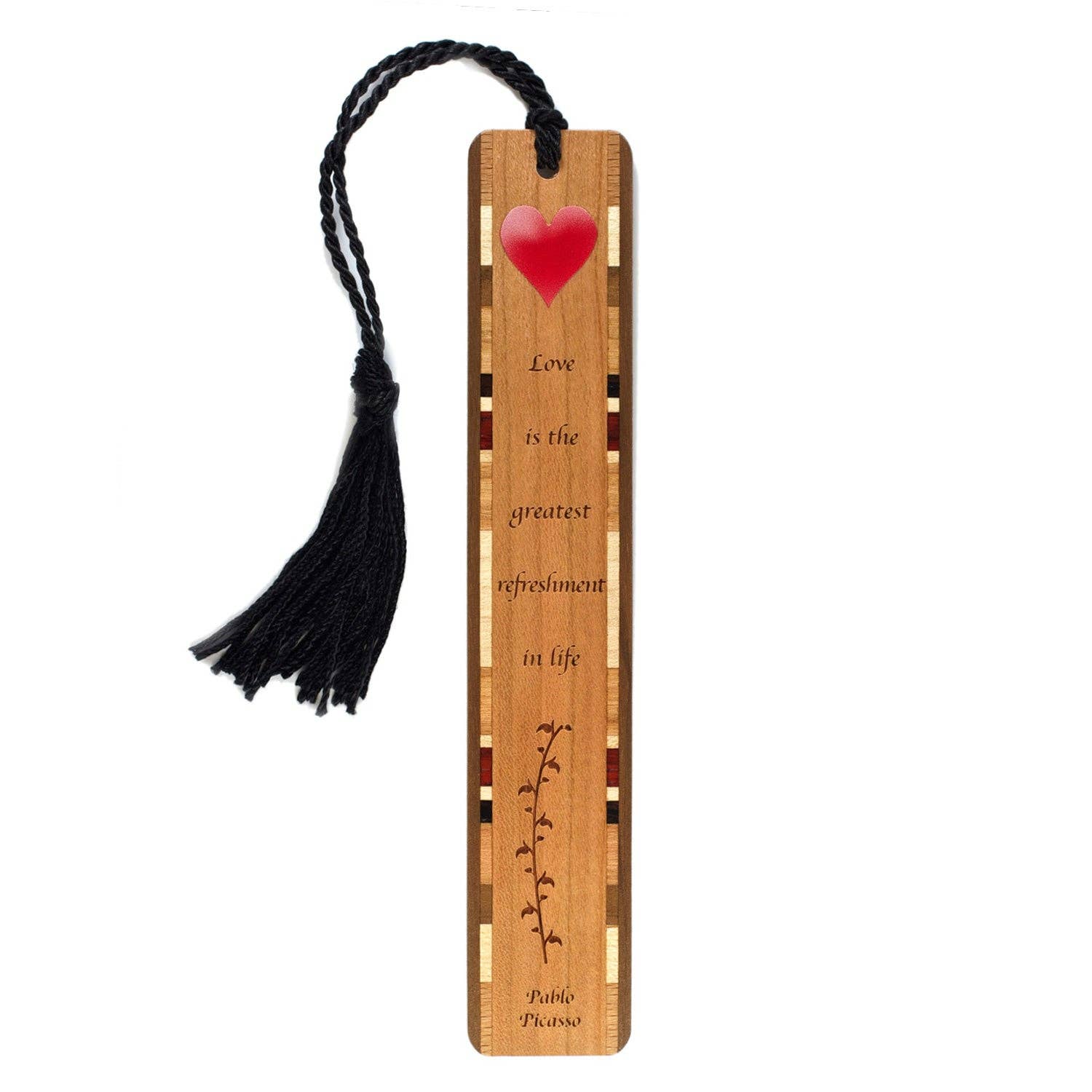 This bookmark showcases the stunning natural grain of cherry wood at its center, bordered on both sides by intricately crafted inlays made from a variety of domestic and exotic hardwood combinations. The laser engraving features an inspiring quote beautifully engraved by Henry David Thoreau. The reverse side of the bookmark is left blank, allowing the natural beauty of the cherry wood grain to shine. The inlay accent combinations will vary, ensuring each bookmark is one of a kind. A braided tassel complements the design.