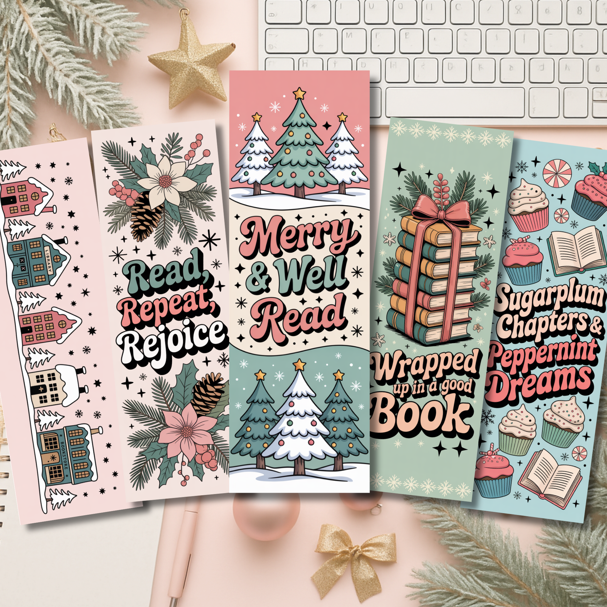 Pastel Christmas Bookmarks, Bookish Christmas Bookmarks, Christmas Bookmarks, Holiday Bookmarks, Pink Christmas Bookmarks, Festive Bookmarks, Pastel Christmas Bookmark, Holiday Bookmark Set, Book Lover Gift, Stocking Stuffer For Readers, Pastel Bookmarks, Cute Christmas Bookmark, Bookish Gift, Cozy Winter Bookmark, Retro Christmas Bookmark, Book Club Gift, Teacher Christmas Gift, Aesthetic Bookmark, Pink Christmas Bookmark, Festive Bookmarks, Reader Stocking Stuffer, Bookish Gifts, Reading Gifts, Gifts for Book Lovers, Reading Stocking Stuffers 🎄 Pastel Christmas Bookmark Set – Bookish Holiday Gifts 🎄 Cozy up this holiday season with these pastel Christmas bookmarks, the perfect gift for any book lover! Each bookmark features a festive, bookish design with a soft retro pastel color palette of blush pink, mint green, and frosty blue – making them as magical as the stories you’re reading. 📚 Bookmark Details: Size: 2 x 6 inches Material: Heavyweight cardstock with laminated finish, there will be a small laminate border. Square corners, no tassel Back side: White with Auburn Row Design logo Can choose no packaging or packaged. Packaging includes each bookmark in a cello bag with a backer card with our logo on it. May not sell item on Amazon, Etsy, Facebook Marketplace, Poshmark, Mercari, or similar platforms. © Auburn Row Design 2025 - All Rights Reserved
