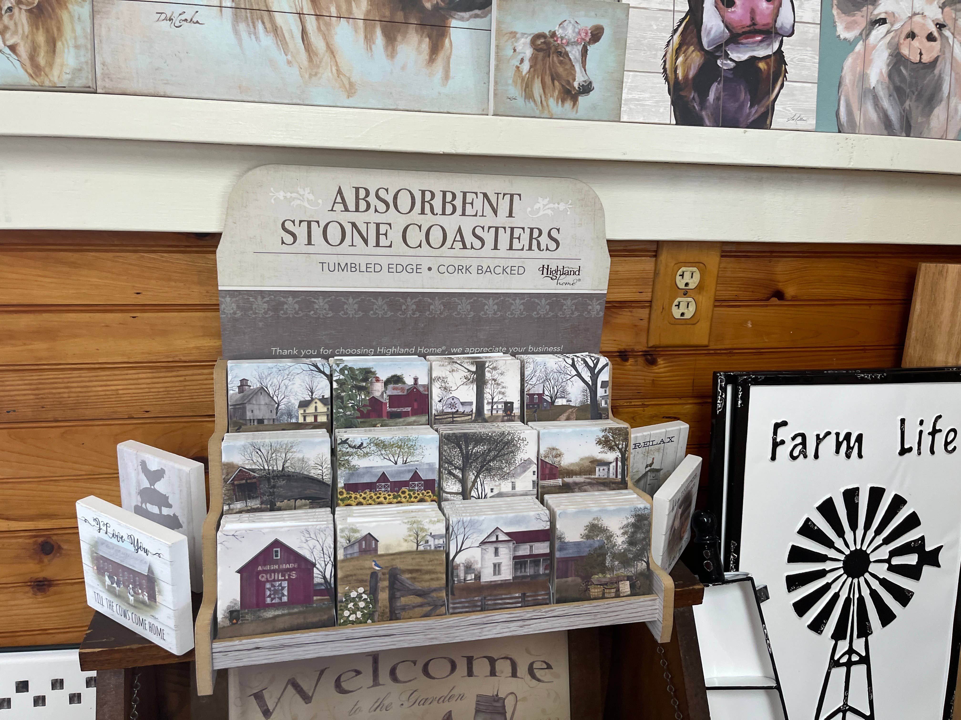 Absorbent Stone Tumbled Tile Coaster Display. Complete Pre-pack is 72 Coasters- 6 each of 12 different images plus wood display. Each Coaster measures 4" x 4" and features Cork Backing to protect surfaces from scratches and stains. Coasters can be reordered individually to restock your display.