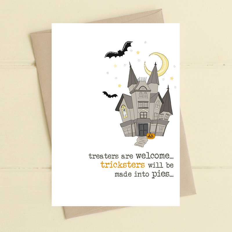 Our boxed Halloween Cards include (6) identical cards and (6) coordinating gray euro flap envelopes, enclosed in our ultra-premium keepsake box. Our box features a clear window, accented with a gold foil pressed border, a magnetic closure, and includes a content label on the backside of the box. It can be stood up on end, vertically or horizontally, and of course on its’ back, giving retailers maximum flexibility in store. Boxes are manufactured in China. Our cards are A2 (4.25” x 5.50”) in size, are flat printed + stamped with gold foil on 100# cover. The cards come with blank white interiors and are printed in the United States.