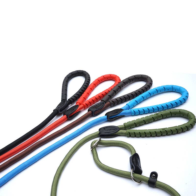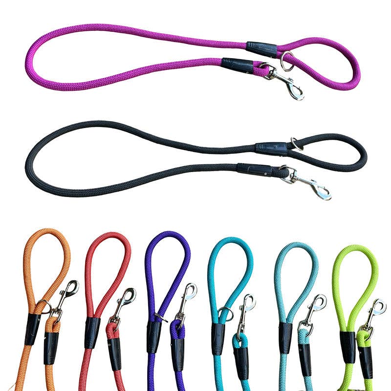 Slip lead & Training Lead in One This slip lead from Miro & Makauri is ideal for quickly slipping over your dog's head when it's time for walkies. No need to fiddle with clips and no need to remove his collar. This slip lead comes with a special metal adjuster which stops the choking action that can happen with some slip leads. It prevents the lead from tightening around your pets neck and is much kinder for him and much more comfortable. The lead can easily be adapted to a training lead, which slips around the neck and snout of your pet. This mode is ideal if your dog is inclined to pull. When he starts to pull, the lead gently tightens around his nose and will slightly pull his head downwards.