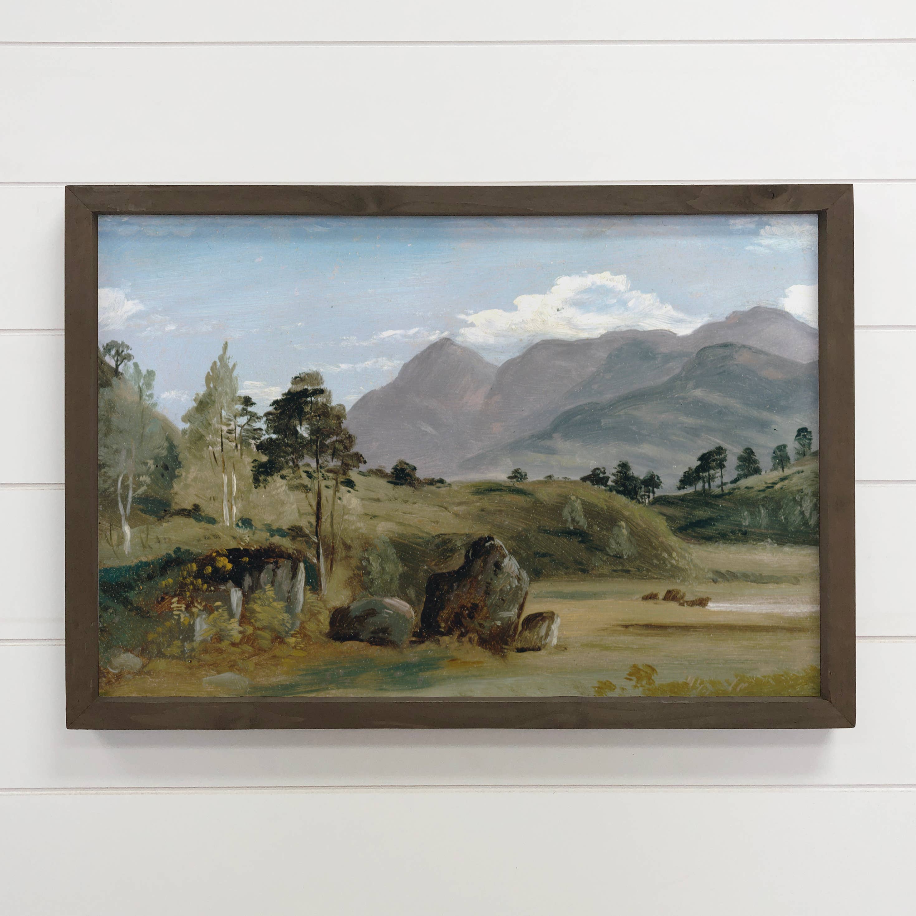 Capture the rugged beauty of the countryside with this art print featuring two darling long-haired brown Highland cows standing in a vast pasture adorned with tall dry grass. Against the backdrop of a moody cloudy sky, these creatures exude a sense of natural elegance. Their distinctive appearance adds a touch of rustic charm to any space. • Printed with high resolution giclee inks • Fine art canvas mounted on wood • Solid hardwood frame in shown stain colors • Sustainable American alder wood • Made in the USA in our Utah studio • Mini 6x10" x 1.25" deep w/ 1/4 thick frame • 12x18" x 1.5" deep w/ 3/4" thick frame • 18x24" x 1.5" deep w/ 3/4" thick frame • 20x30" x 1.5" deep w/ 3/4" thick frame • 24x36" x 1.5" deep w/ 3/4" thick frame • Signs may have +/-1" variations • Signs can stand on a shelf or table or can hang on the wall from the back edge of the frame • Farmhouse style frames have rustic imperfections that make them unique
