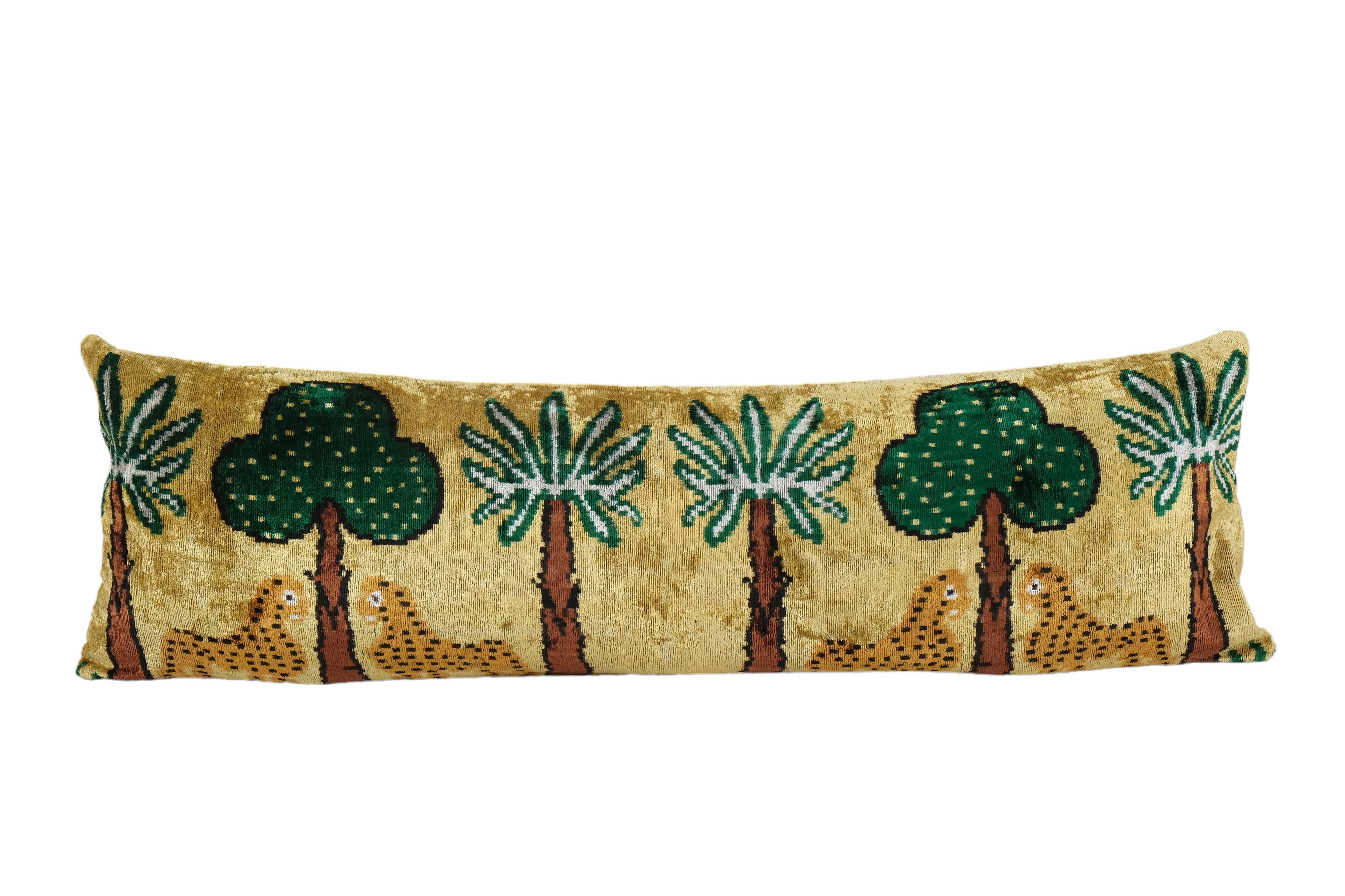 Tiger Ikat Velvet Bedding Pillow, Silk Lumbar Cushion Cover, Yellow Animal Lumbar Pillows, Boho Pillow Decorative Throw Velvet Ikat Pillow -Luxurious cushion cover of handloomed ikat fabric -Insert is NOT included -Ikat is an beautiful fabric, every pillow is unique but can also contain small imperfections; the charm of a handmade product. Dimensions: 16ʺW(40 Cm) × 6.0ʺD(15 Cm) × 44ʺH(110 Cm) approx -Handloom 100% silk velvet fabric -Back side is cotton fabric and with hidden zipper. -Handwoven velvet pillow case only, -Hand wash 30 C or dry clean -Custom duties may apply.