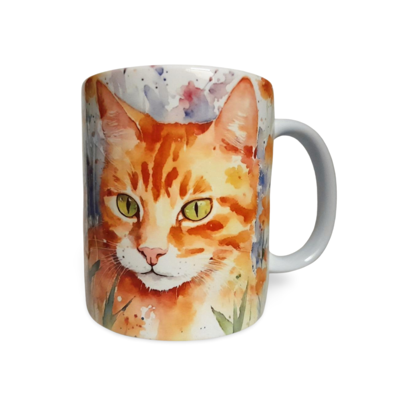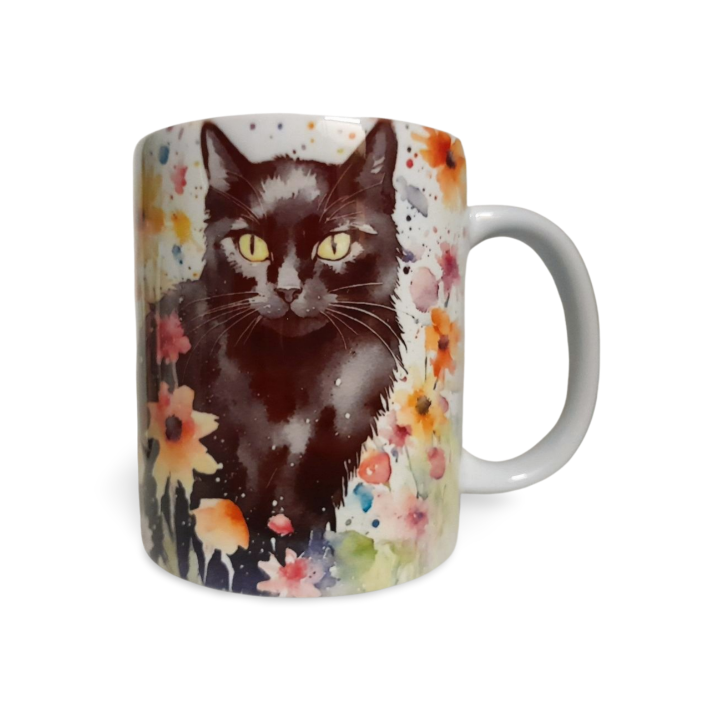 Tortoiseshell Cat sitting in flowers watercolour style mug, 11oz/325ml capacity. A large solid tea or coffee mug with a comfortable handle. Designed and printed by Rockways Designs. Dishwasher Safe Microwave Safe 9.5 cm Height 8 cm Diameter Hand Printed