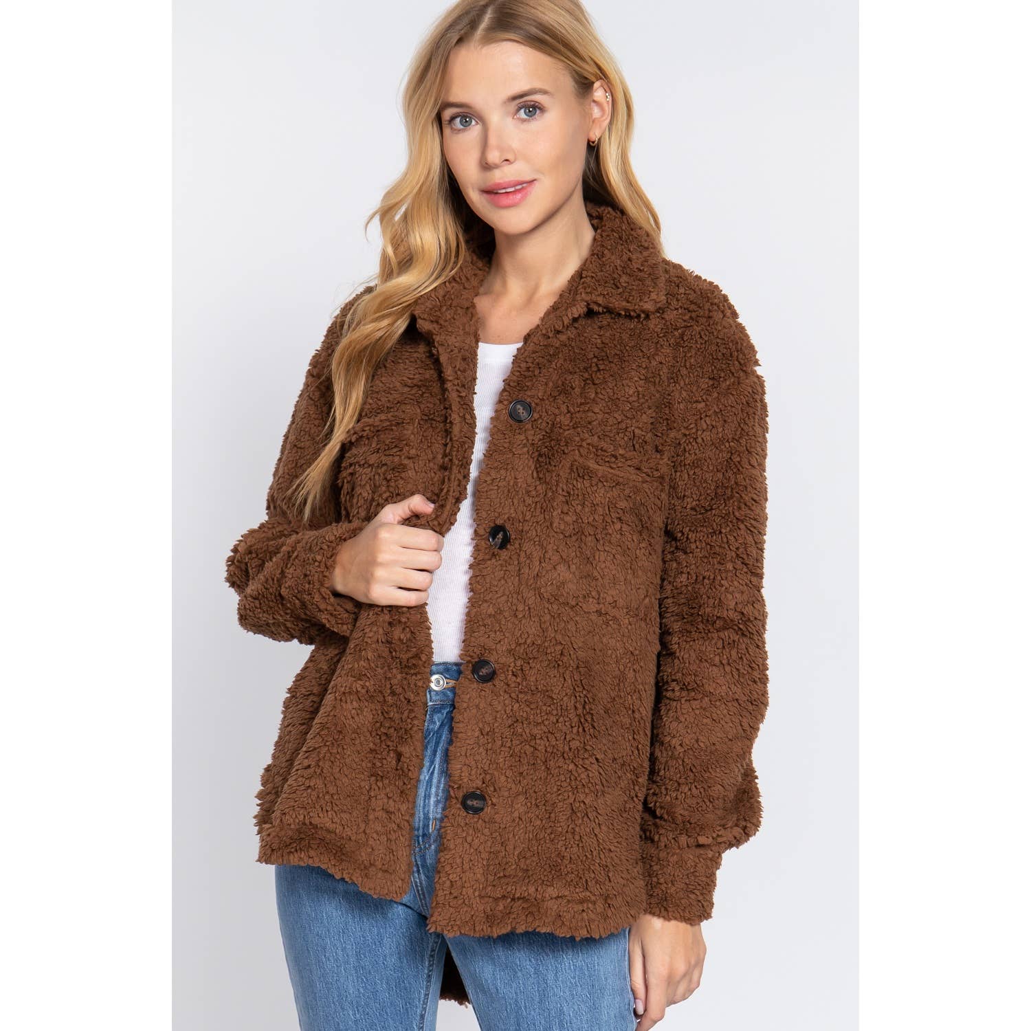 * Style No.:APJ13586AB LONG SLEEVE FAUX FUR COLLAR FRONT POCKET PLAID SHACKET