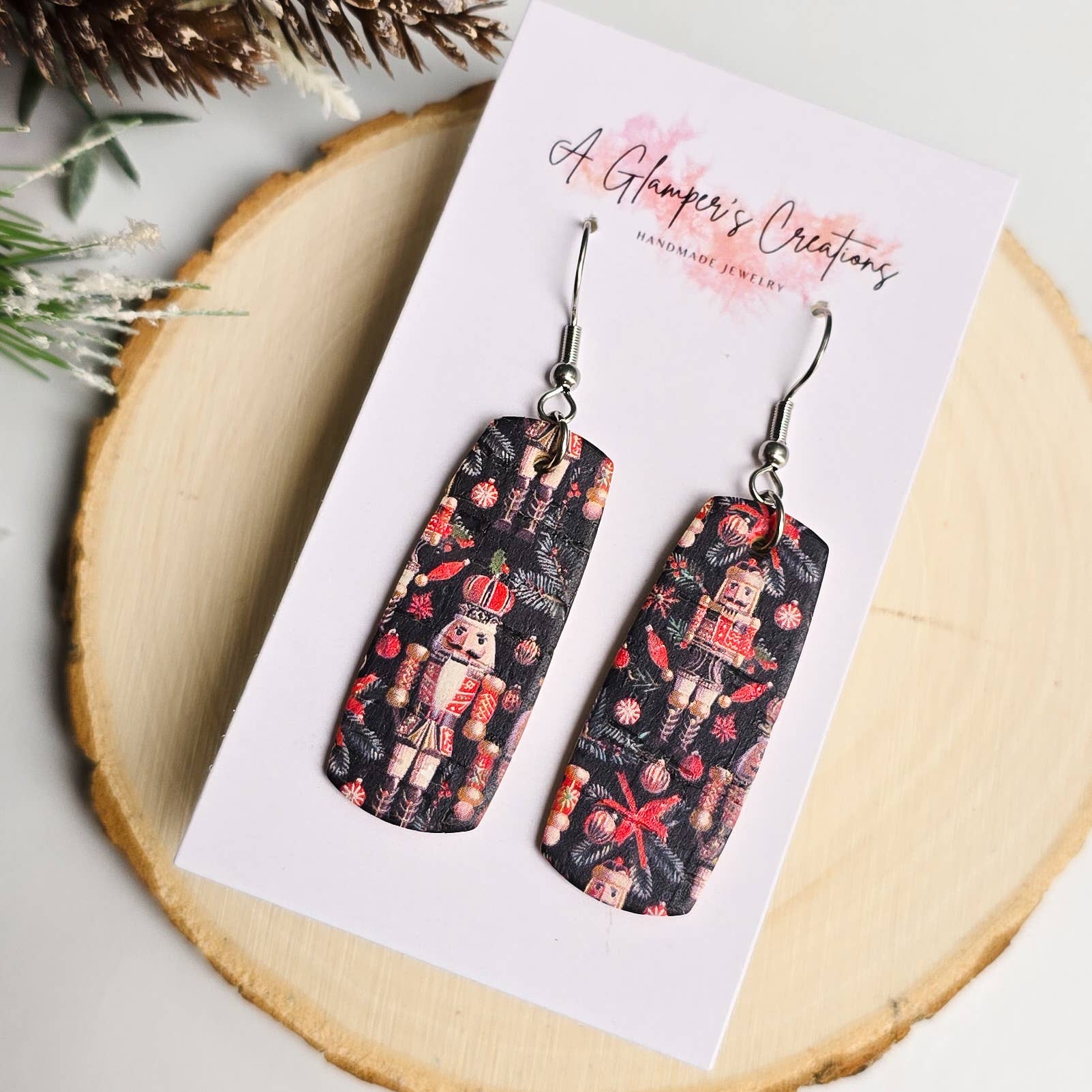 Christmas Mini Bar Leather Earrings Earrings are made of high quality cork backed with genuine leather. These are perfect for Christmas! Dimensions: approximately 1.5 inches Hooks are hypoallergenic stainless steel and come with rubber backings on an earring card. Please note that the print placement may vary for each pair of earrings due to where it is cut from. Please note that printed cork leather sometimes may have an aged look to it. Please also note that the backs of all genuine leather earrings are natural backings of the leather.
