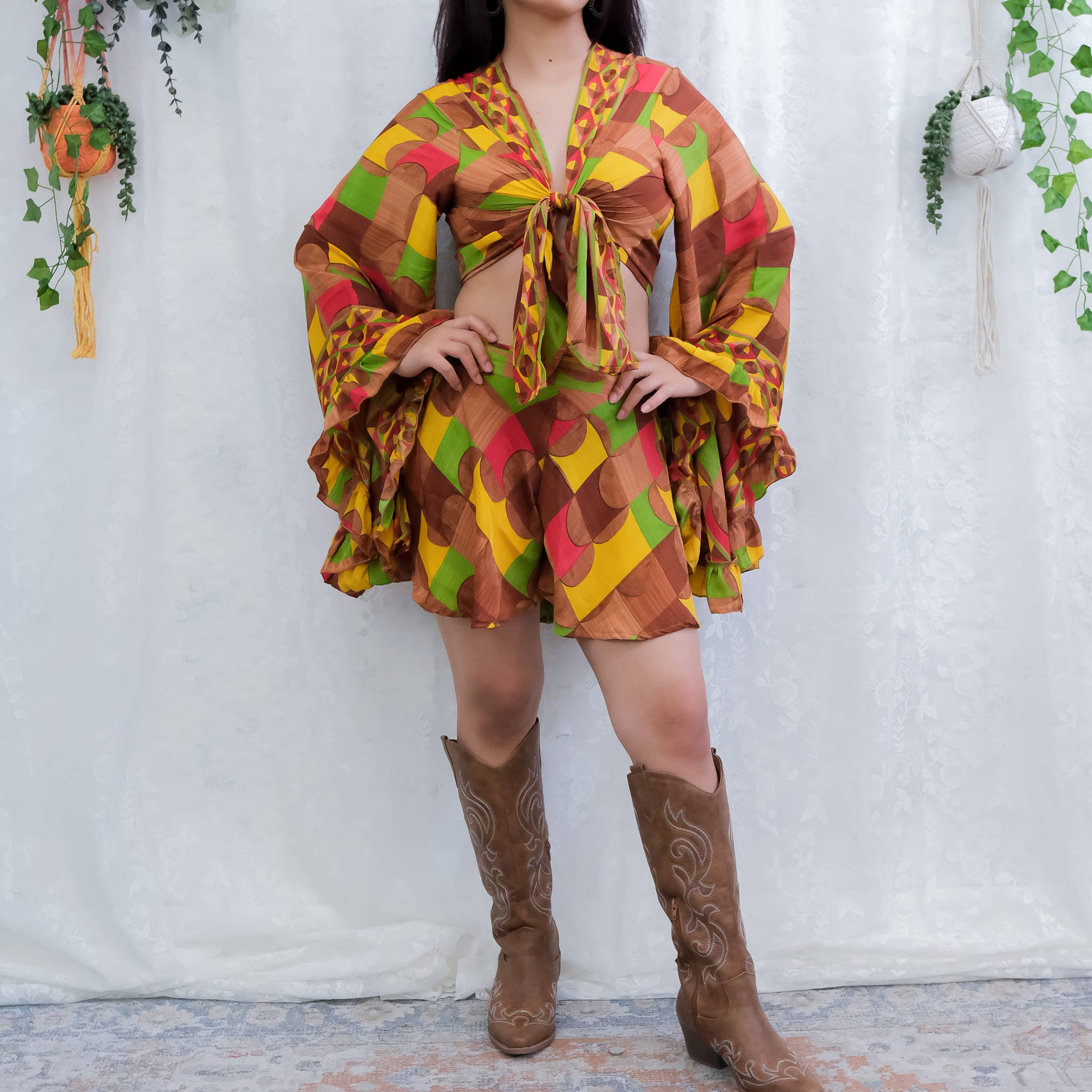 Experience the carefree style of the Bohemian Bliss Shorts with Ruffle Sleeve Top. This handmade set exudes a bohemian vibe, perfect for festival fashion. With a vibrant color and comfortable elastic waist, this two piece matching set is both chic and inspired by Stevie Nick's iconic fashion. Handmade Material: Recycled Silk ***Elastic Waist MEASUREMENTS SHORTS MEASUREMENTS Length: Approx. 15 inches Waist: Fits up to Approx. 36 inches Hips: Fits up to Approx. 38 inches TOP MEASUREMENTS Length: Approx. 15 inches Bust: Approx. 38 inches
