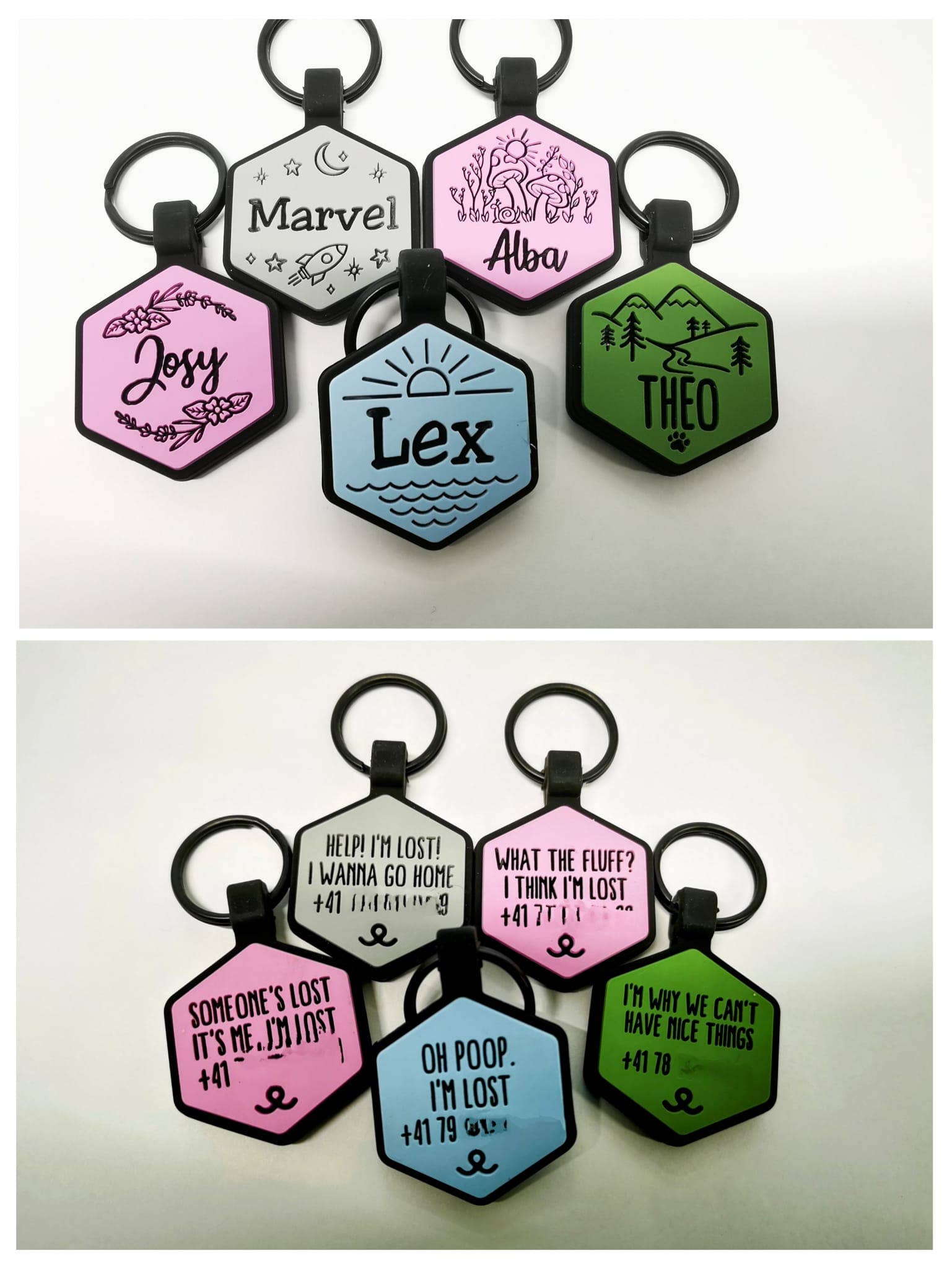 A mini version of our best-selling tags, available in 10 colors and 20 designs. Customized with the name on the front and contact info on the back. Besties tags are super cute and ultra durable, which means you can be confident that this tag will last through any excursion, dogpile, or catfight. Oh, and what’s that noise you ask? That, my friend, is the sweet sound of silence. Features and Benefits 🔕 Jingle-free - Besties 100% Silicone tags are strong, flexible, and resilient ⚠️ Safe - With our deep custom engraving, you can rest assured that your emergency contact information is always legible when you need it most 💪 Durable - Metal tags scratch and fade, silicone stands the test of time ✨ Adorable - Stand out from the pack 💦 Waterproof We offer drop-shipping for single customer orders. Place the order, making sure you update the shipping address. Have any questions? Shoot us a message and we'd be happy to discuss!