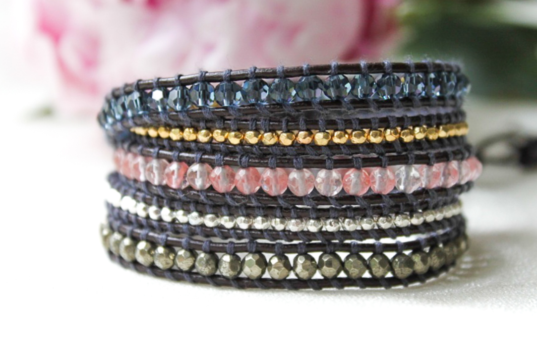 Osaka - Smoky Pyrite and Pink Mix Leather Wrap Bracelet