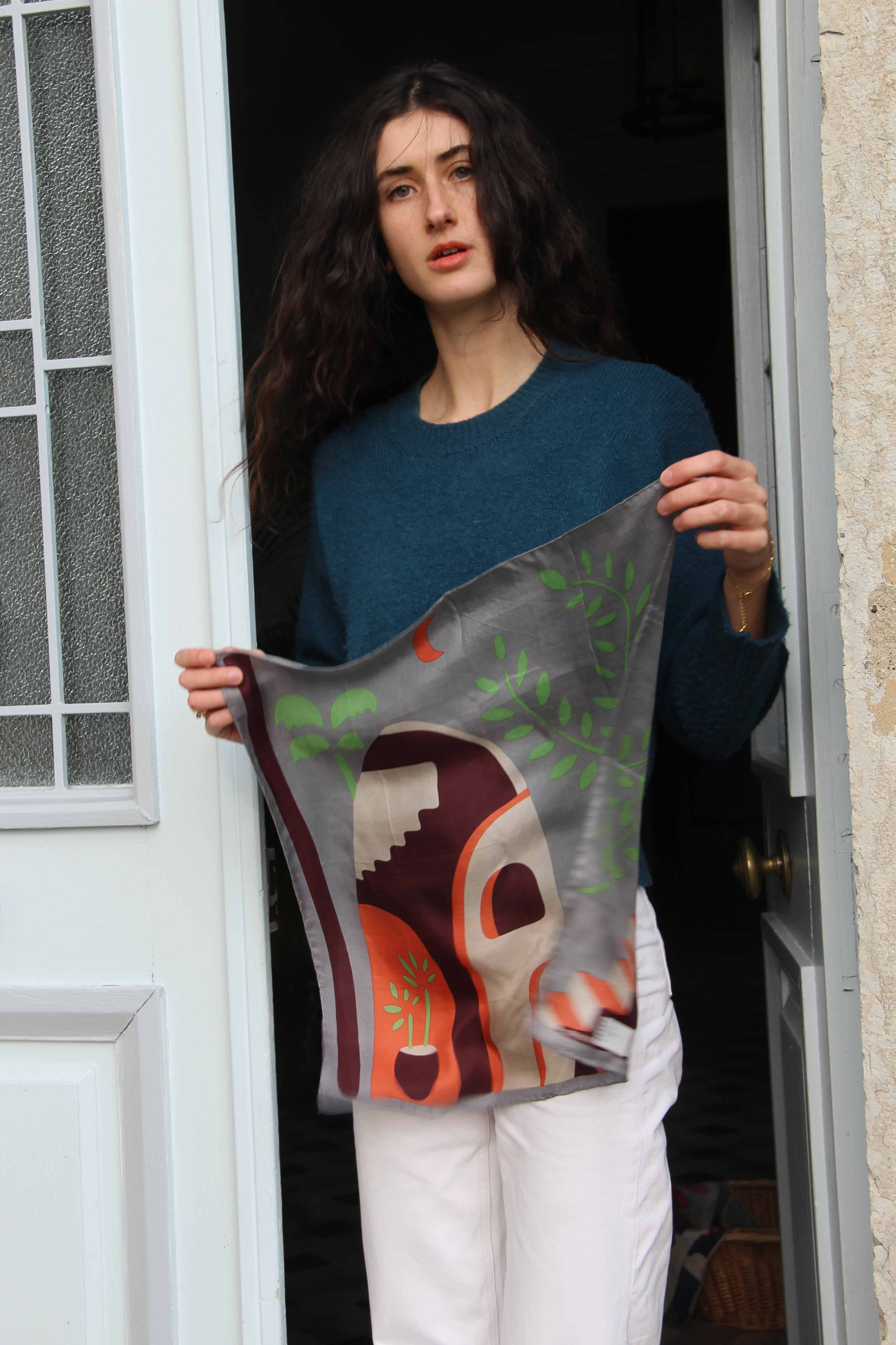 Mini Scarves make an original gift, they can be worn around the neck, around the wrist, as a headband, in a bun or even around the bag... They are drawn by hand in France and printed by hand in India. They have an exceptional finish with a hand-rolled hem. They are sold in a box inspired by vintage matchboxes. 100% silk 50 x 50 cm Hand drawn in France Hand printed in India