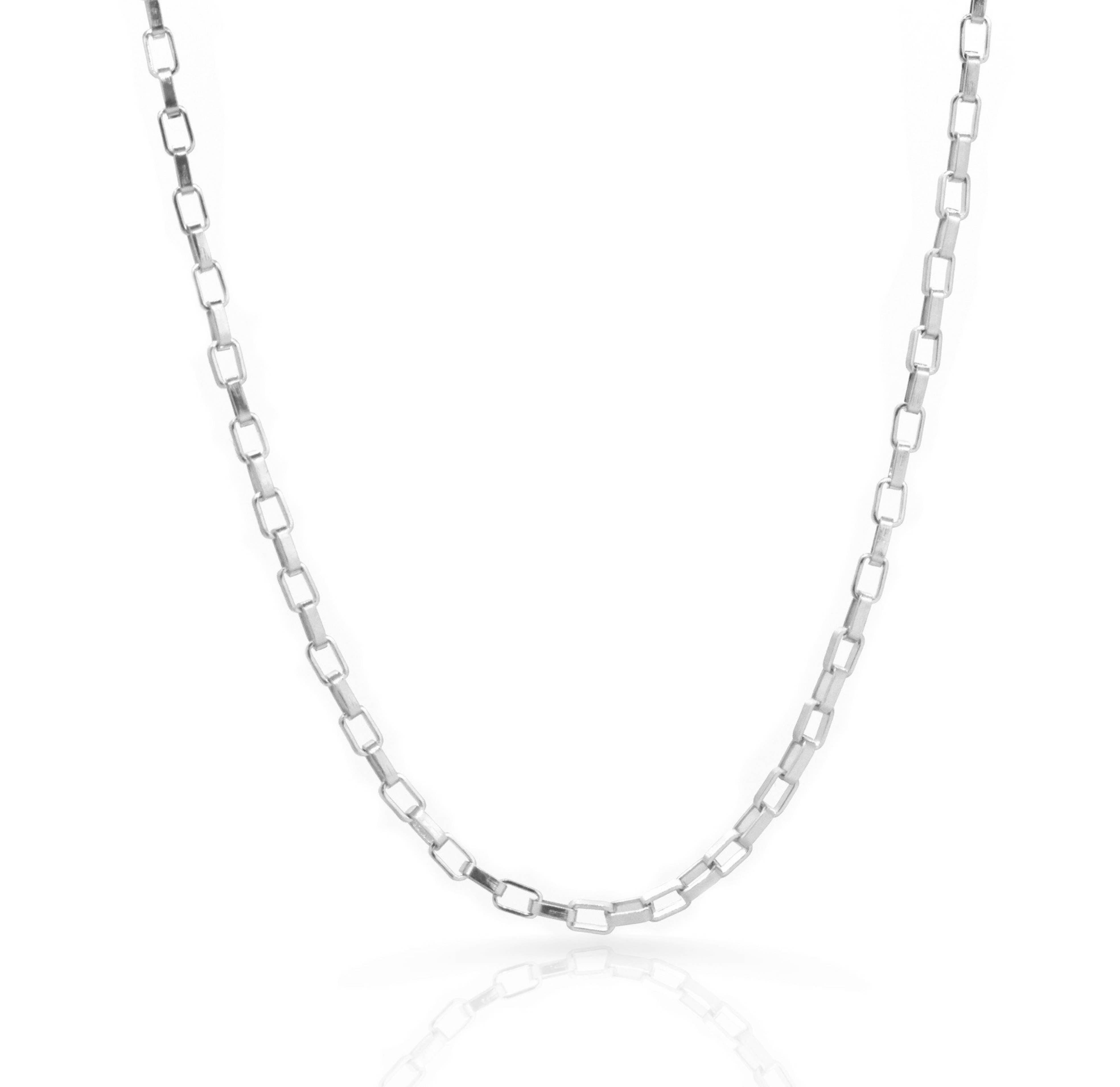 ADJUSTABLE SILVER LARGE CURB CHAIN NECKLACE Options for the ladies and gents Day or night, the Mason chain necklace makes an easy choice to complete your outfit. The Mason necklace features a chunky Curb chain made in stainless steel and finished with high polish for extra shine. We have created a version for both woman and men. For the ladies we have added an extension to the chain so that this versatile statement piece can be worn as a choker or elongated using the extension to layer with your favorite pieces. For the gents, the necklace is made without the extension. Materials: Stainless steel, silver plated Measurement: 9mm width. Length 15.