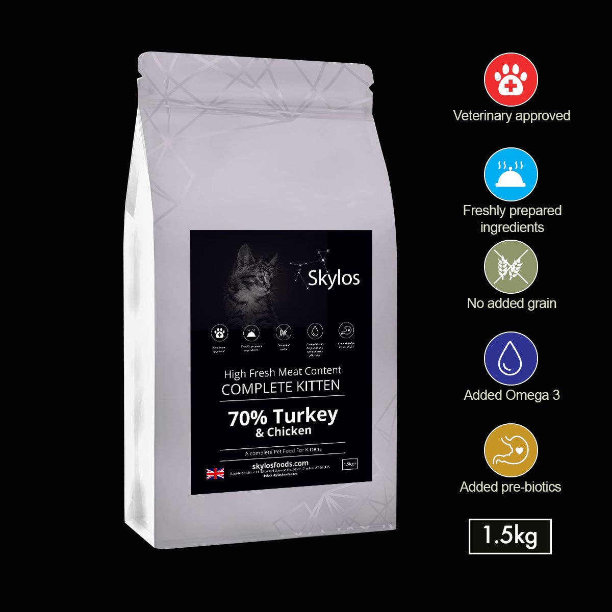 Specifically developed for Sterilised or Neutered Cats to provide a selection of high protein and high total animal content recipes that are irresistible. Formulated to offer an assortment of the finest freshly prepared animal protein sources with added functional ingredients to help care for a cat’s health. It is also perfect for Weight Control or Senior Cats. * Urinary Tract Health * Sterlised or Neutered Cats * Healthy Weight Management * Hairball Care * Healthy Digestion * No Additives, No preservatives, Grain Free & Gluten Free Composition: 70% Chicken, Tuna and Salmon (including 28% Dried Chicken,26% Freshly Prepared Deboned Chicken, 10% Dried Salmon, 4% Freshly Prepared Tuna, 2% Chicken Fat), Peas, Lentils, Chickpea, Cellulose (2.5%), Beet Pulp (2%), Hydrolysed Liver Gravy,Salmon Oil, Minerals, Fructooligosaccharides (FOS, 480 mg/kg), Glucosamine (180 mg/kg), Methylsulfonylmethane (180 mg/kg),Chondroitin Sulphate (125 mg/kg), Mannanoligosaccharides (MOS,120 mg/kg), Dried Cranberry, Yucca Extract (180 mg/kg). Nutritional Additives per kg: Vitamins: Vitamin A 25,000 IU, Vitamin D3 1,730 IU, Vitamin E 255 IU Provitamins: Taurine 2,000 mg, L-Carnitine 2,000 mg Trace Elements: Zinc (Zinc Sulphate Monohydrate) 96 mg, Iron (Iron (II) Sulphate Monohydrate) 72 mg,Manganese (Manganous Sulphate Monohydrate) 29 mg, Copper (Copper (II) Sulphate Pentahydrate) 10 mg, Iodine (Potassium Iodide) 3.7 mg, Amino Acids: Methionine 2000 mg, Lysine 500 mg. Analytical Constituents: Crude Protein 44%, Crude Fat 11.5%, Crude Fibre 4.5%,Crude Ash 9.5%, Moisture 5%, Omega 6 Fatty Acids 2.4%, Omega 3 Fatty Acids 0.6%, Calcium 1.9%, Phosphorus 1.5%. Metabolisable Energy 370 kcal/100g. Bag size: 300g, 1.5kg and 5kg. Feeding Guide* Weight of Cat (kg) Grams Per Day (g) 1 - 2kg 20 - 30g 2 - 3kg 30 - 40g 3 - 4kg 40 - 50g 4 - 5kg 50 - 60g 5+kg 60+g * These guidelines should be adapted to take into account breed, age, temperament & the activity level of your cat. When changing foods please introduce gradually over a period of 2 weeks. Ensure a supply of clean water is available at all times. Store in a cool, dry place.