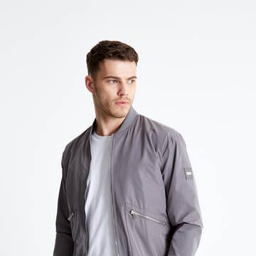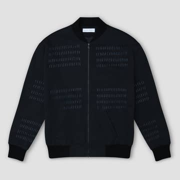 A heavy-duty bomber jacket crafted from organic soft wool in a dramatized ottoman stitch with calf leather detailing along its sides and sleeves. A geometric and defined silhouette with broad shoulders and a cinched waist. Two pockets, high collar, ribbed cuffs, as well as substantial lining for premium insolation. Frontal snap-button closure at center front. Dry-clean only 100% Wool