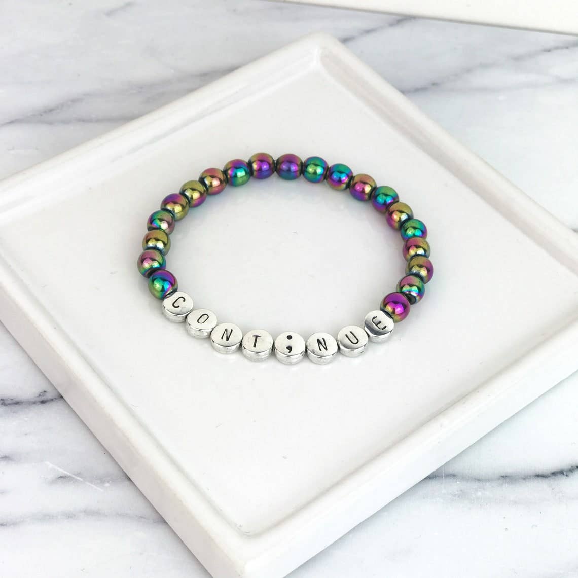 Silver beaded bracelet with hand stamped silver letter accent beads and 8 bead options (silver or various gemstones). Dimensions: beads measure 6/7mm in diameter. Stretch bracelets fit most adult wrist sizes. If you would like it to be made to a specific size please let us know when ordering. Handmade in Ireland. Customisable. We can change or add any of our available letters or symbols to this piece on request. Please simply contact us with instructions. Beads can also be mixed on request. Any other styles pictured are shown for illustration purposes.