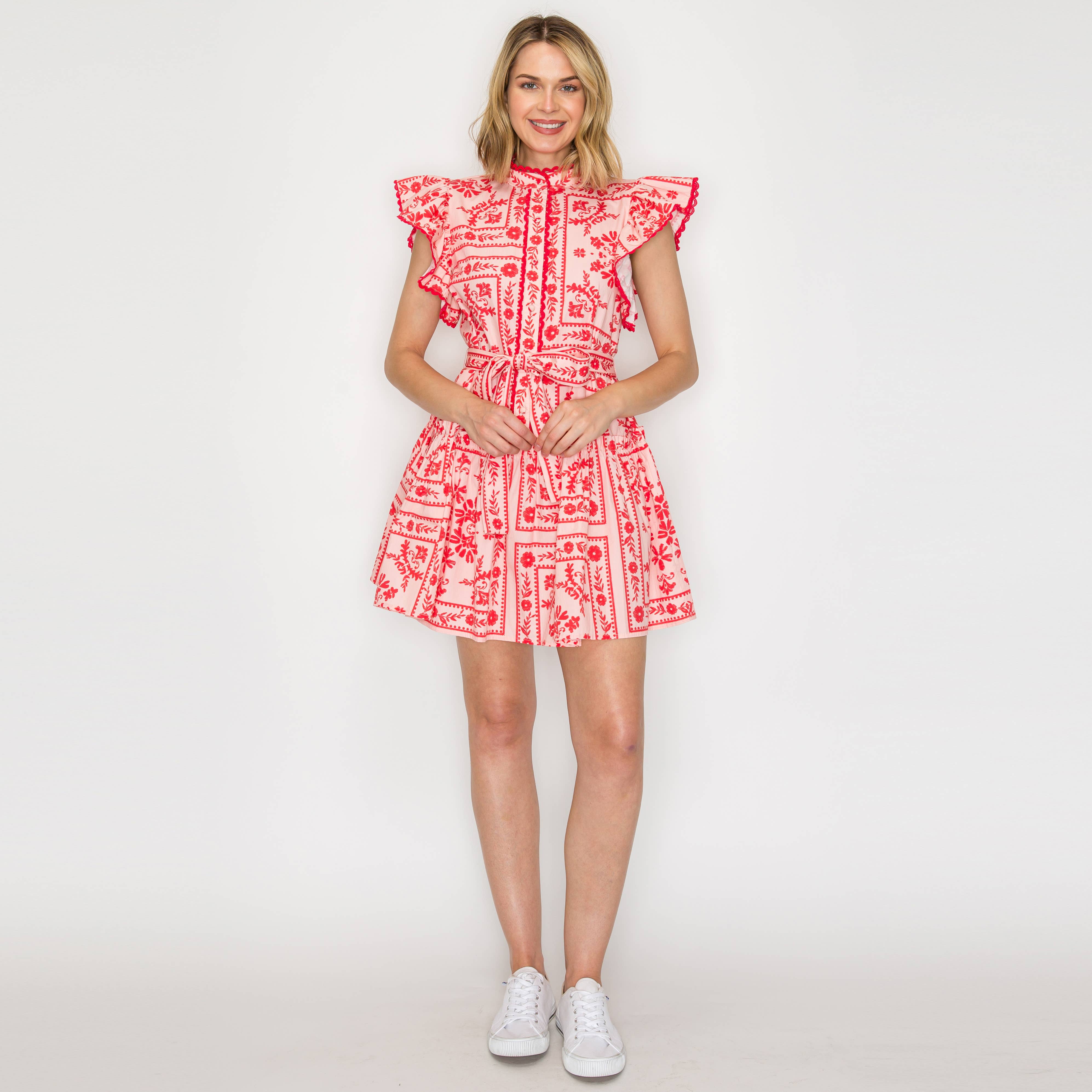- Small flower patterned cotton eyelet mini dress - Button down / open - Hi & Lo hem design - 3/4 sleeves with elastic cuff - Loose & comfy fit - Full lining - STYLE# - LWD2533 * HPS - 34" * C.B - 37" SELF - 100% COTTON