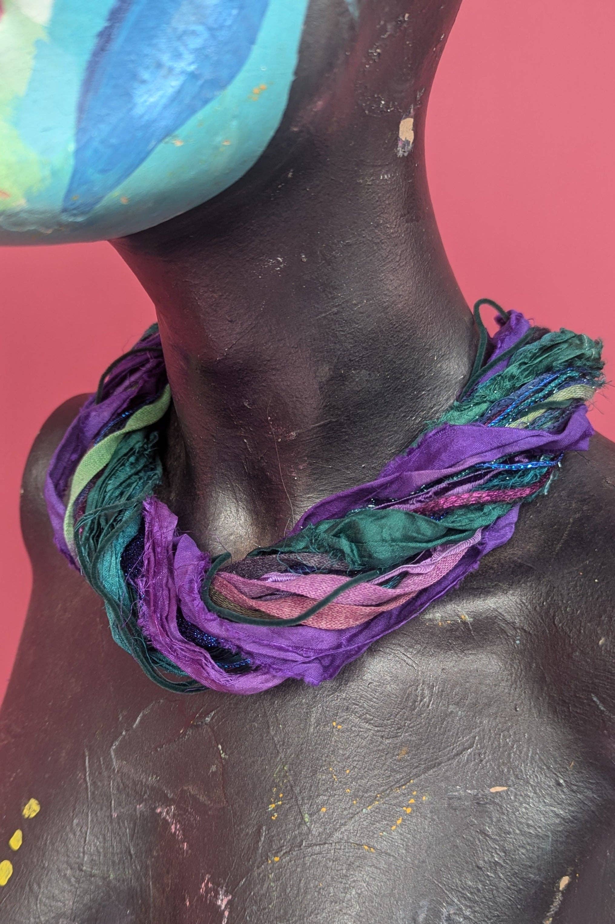 Description: Multi strand, silk yarn necklace with magnetic clap. Features over twenty strands of various novelty yarns. Torn sari silks and hand painted polyamide are often used. Over 30 colourways available and updated regularly. Each necklace is unique and may not include every material pictured but will follow the same colour theme. Please contact us directly for custom or alternative colour options. Size Options: Standard length approx 21 inches. *Additional sizes can be made-to-order. Please get in touch, we're happy to help. Composition: Multi fibre. Care Instructions: Spot Clean. Made to Order: Please note that this item is made to order and can take up to 21 days to be made prior to shipping.
