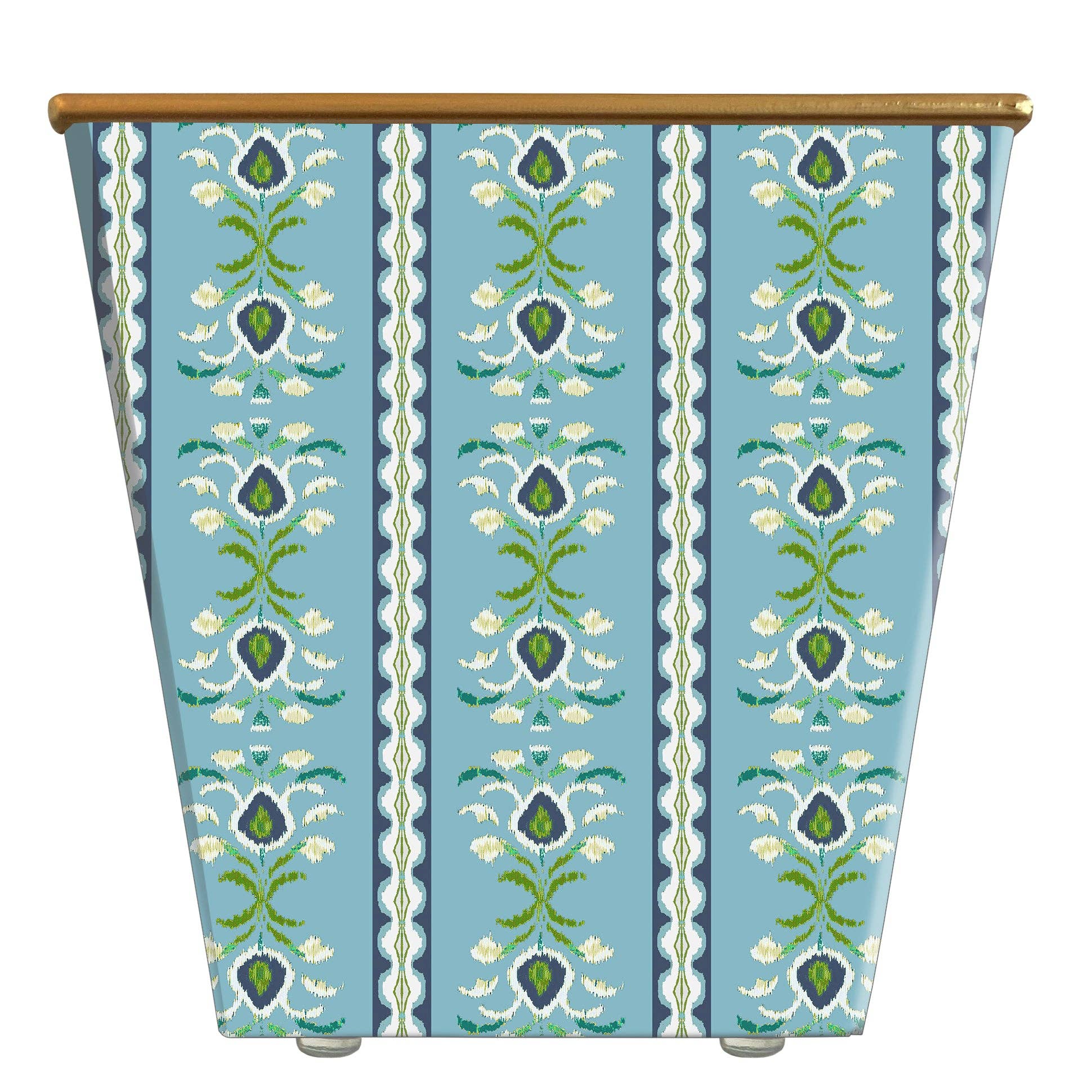 Perfect for flowers and plants, in pairs on a mantle, on a table as a centerpiece, or filled with goodies to become a gift basket, your cachepot will be individually decorated in the pattern and color you have selected. Containers Only * Dimensions: Standard: 5 1/2" square at top rim, 3 5/8" square at base, and 5" tall Large: 6 1/2" square at top rim, 4 5/8" square at base, and 5 7/8" tall Extra Large: 7" square at top rim, 5 1/4" square at base, and 7 1/8" tall * Handcrafted of composite material, wrapped in decorative paper, and finished with a burnished gold or distressed rim — four protective pads support its base. Proudly made in the USA! * Each cachepot is watertight, however, when used for live plants or fresh flowers, the use of a liner is recommended. Choose one (1) SIZE and one (1) COLOR using the buttons below ⬇