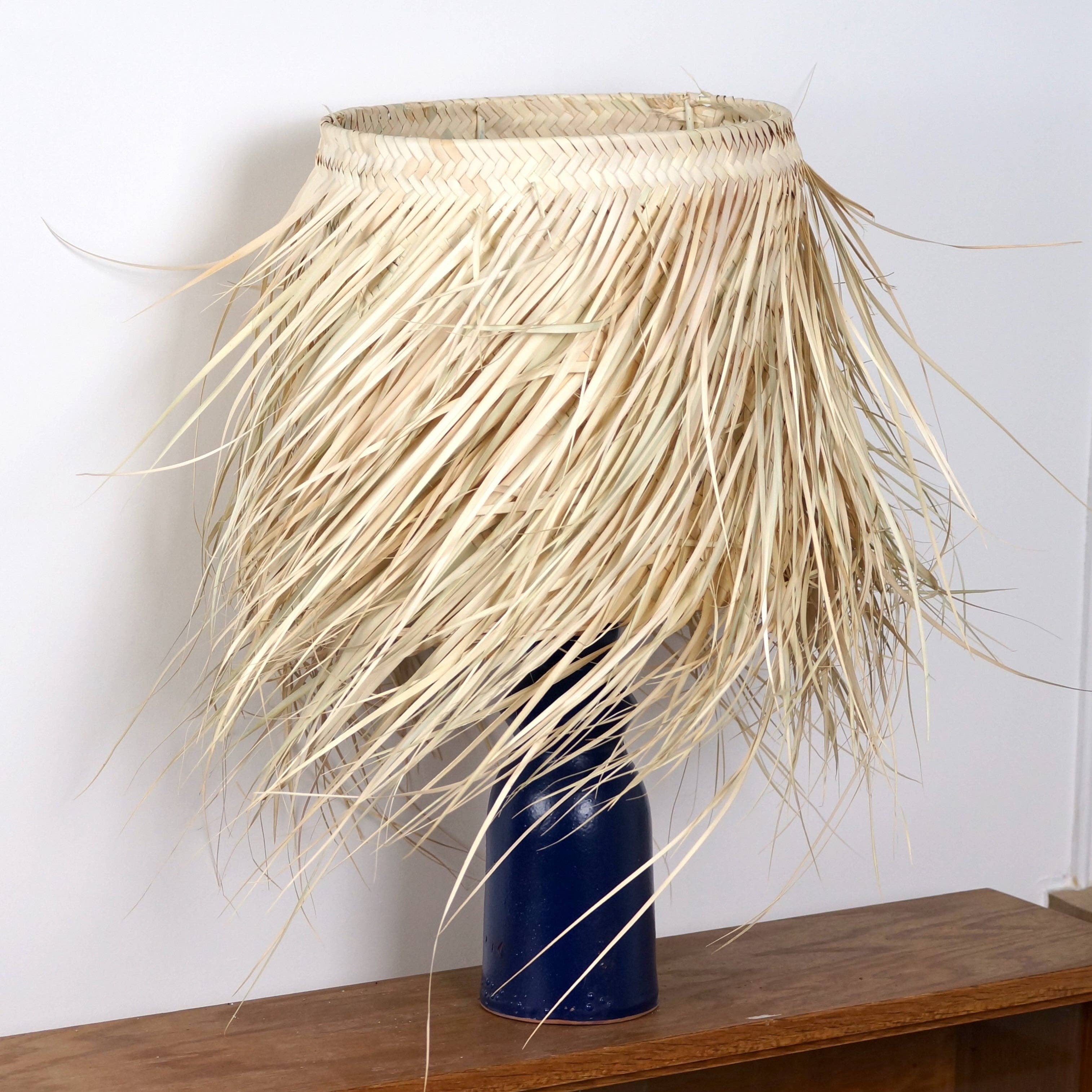 A fringed lampshade for a table lamp for a bohemian chic interior that is definitely trendy! The natural material of this light fixture allows it to be easily installed in the bedroom, living room, or entrance. The round palm leaf lampshade attaches to a floor lamp or bedside lamp with an E27 socket. It has a socket support (socket not included). It comes in 3 sizes: Size S: Ø30 x H20cm Size M: Ø40 x H25cm Size L: Ø50 x H30cm Materials: Palm leaves and wrought iron The fringed chandelier is also available in other sizes. This item is a lampshade for a table lamp and not a pendant light.