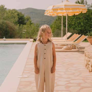 A unisex long overall in a linen–cotton blend in Lichen Gingham, a muted green and beige check Cut with an oversized silhouette Key Features * * Extended leg length for growth * Elasticized back waist * Adjustable brown straps with snap closures * Antique brass snaps (lead- and rust-free) * No snaps for diaper changes * Designed in the USA