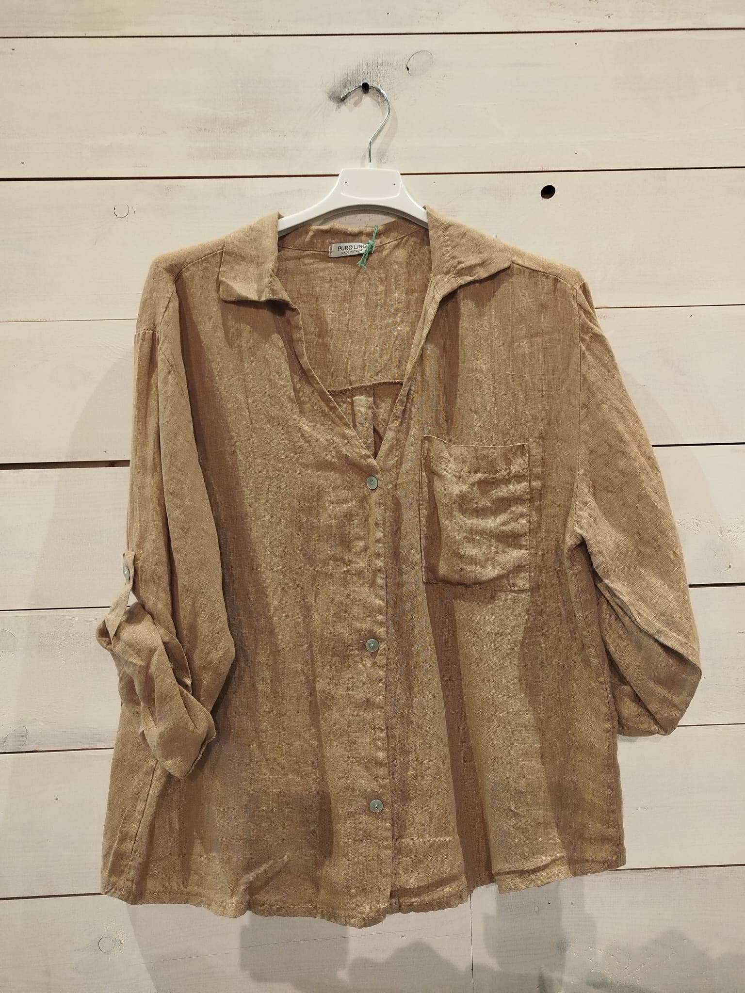 Measurements: approximately 73cm in length and 57cm in width. Shirt with rolled-up sleeves Composition: 100% Linen