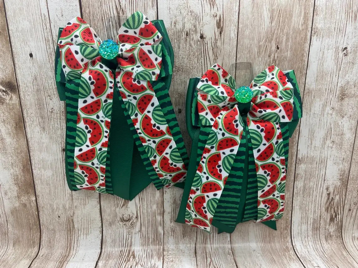 Horse show hair bows for short stirrup divisions, children's ponies divisions, and leadline. Beautiful, one-of-a-kind show bow, sold in a set. finished with a metal alligator clip in the back. Bows are sold in matching pairs. There are two bows to a set. you will need one set of bows for two braids. These bows are handmade. Though I do my best to make each bow in the set the same, there will be differences within the set.