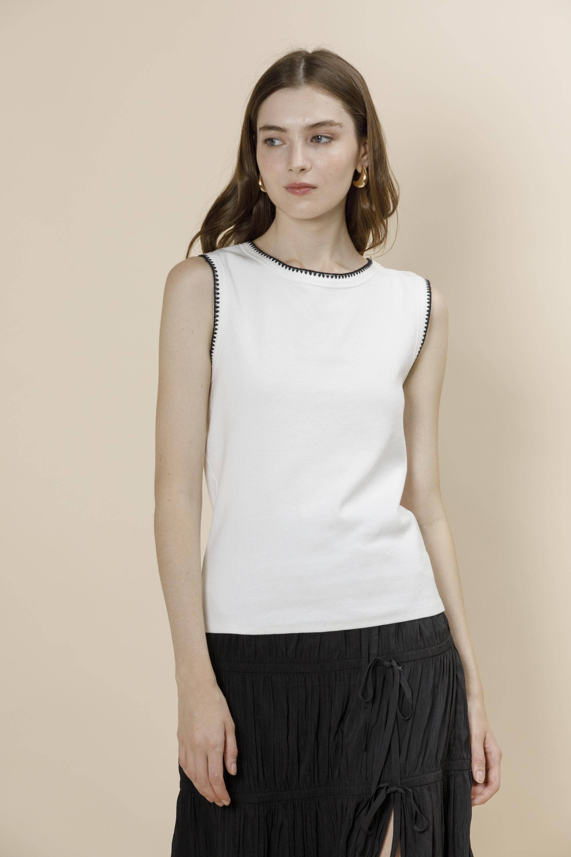 Playful sleeveless knit tank featuring oversized embroidered bow detail. Lightweight, breathable, and versatile for layering year-round. Model is 5' 8'' wearing a size S ---------------------------------------------------------------------------- Lightweight breathable knit Sleeveless Oversized bow embroidery detail Ribbed crew neckline and hem Perfect for girl core, soft aesthetic lovers Easy to style for spring, summer, and early fall 💡 Buyer Tip Perfect as a statement knit for summer or layered over blouses in cooler months—an easy bestseller with feminine charm.