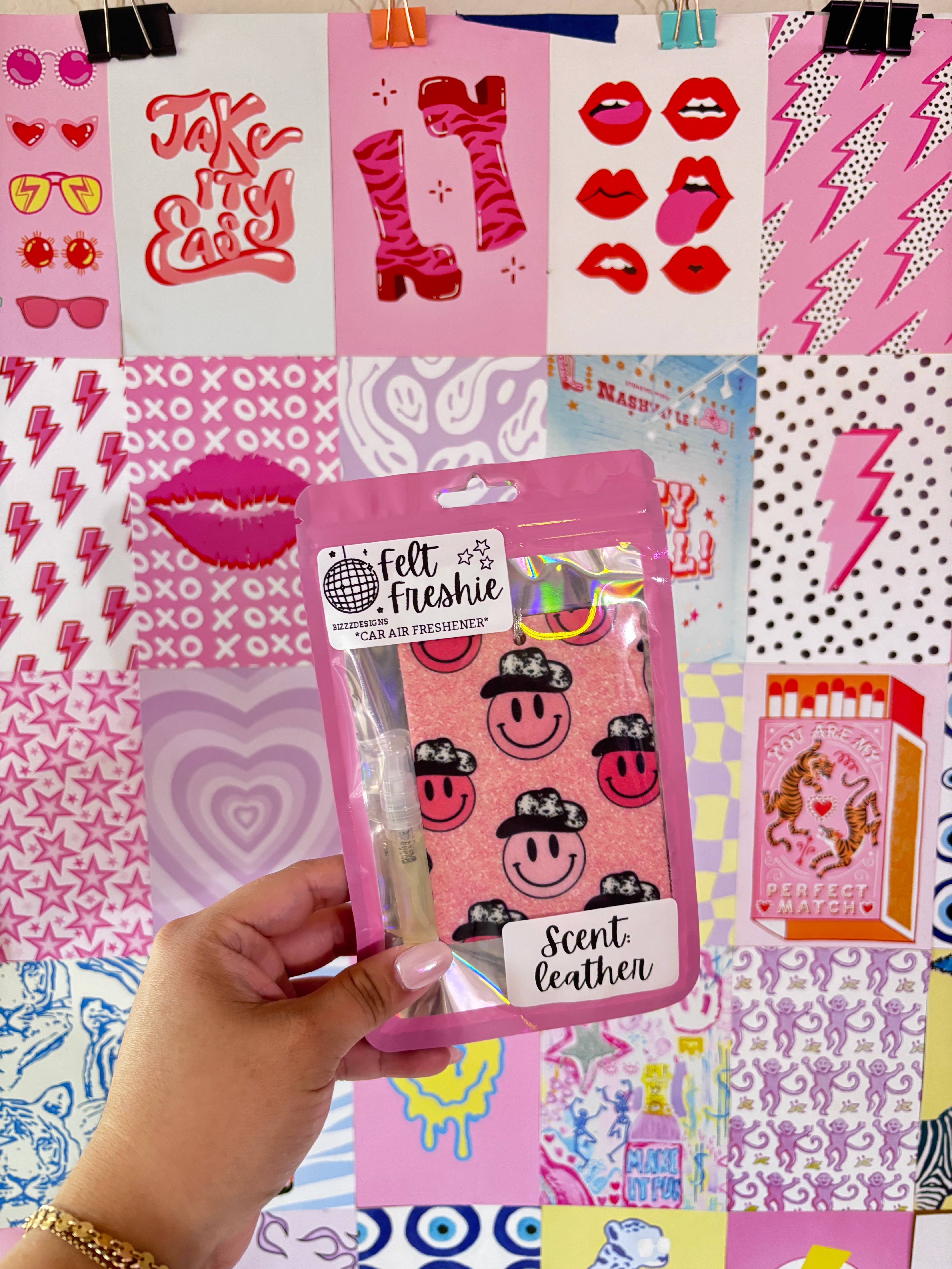 each case comes with 5 individual felt freshies *design is on BOTH SIDES*- each one comes with a 3ml spray bottle of fragrance. they come unscented, you / your customer spray it to their liking so they can control the scent and re-spray as needed | usually lasts 3-4 weeks. suggested retail is $14 each