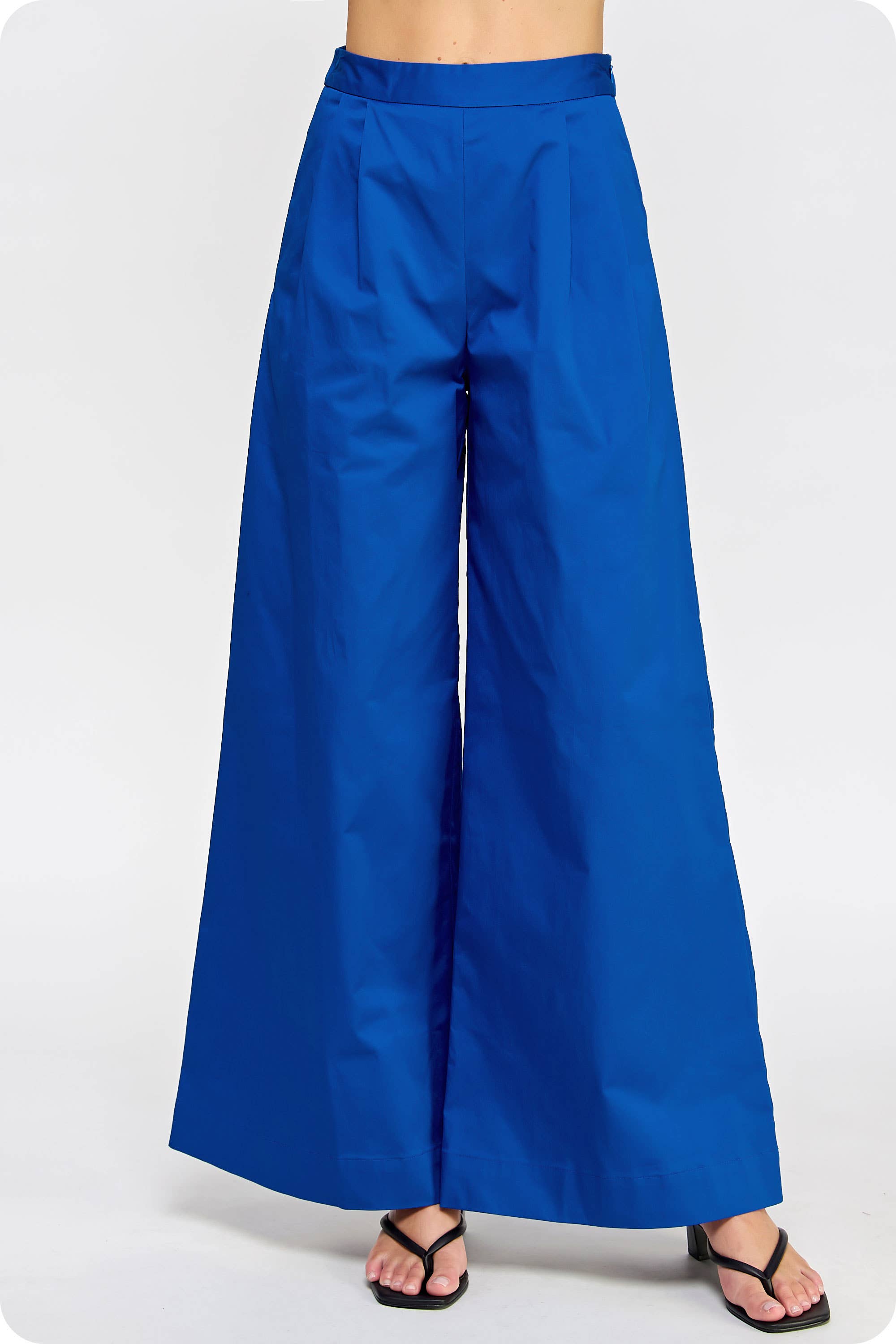 Wide leg trousers with front pleat detail in glossy satin fabric. Featuring pleated detail departing from the waist band, this style is cut with wide legs, side seam pockets, and elastic waist band at back. It can be made into a set with shirt blouse T-6905-JK