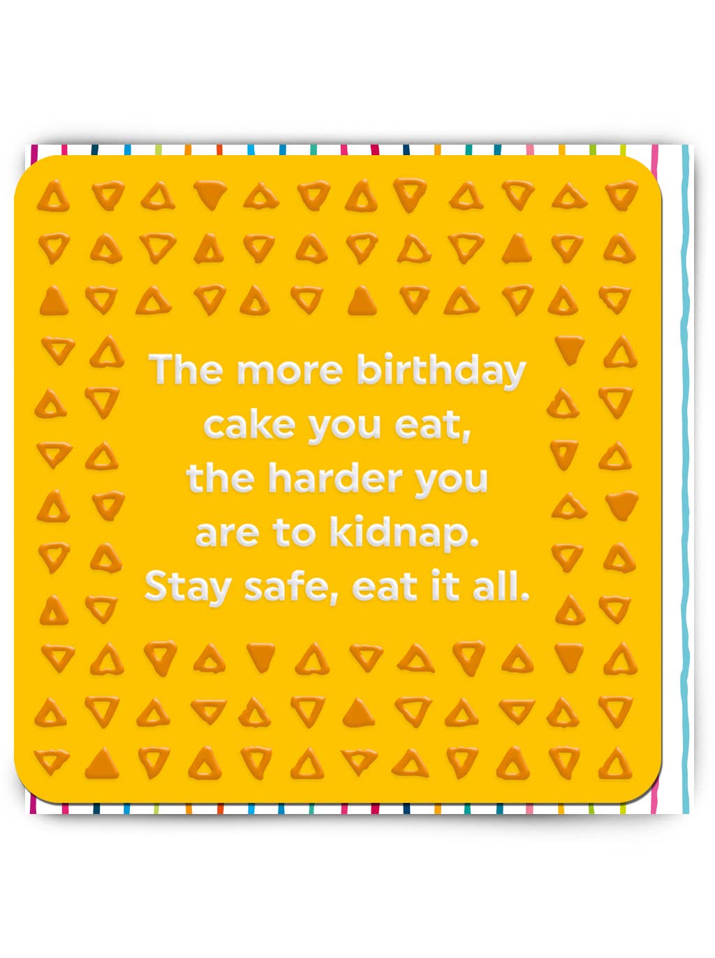 SKU: REL010 Made in United Kingdom Colour: Multi-coloured Finish: Embossed Occasion theme: Birthday Special feature: Blank Tone: Funny Weight: 18 g (0.63 oz) Dimensions: 14 x 14 x 0.2 cm (5.5 x 5.5 x 0.1 in)
