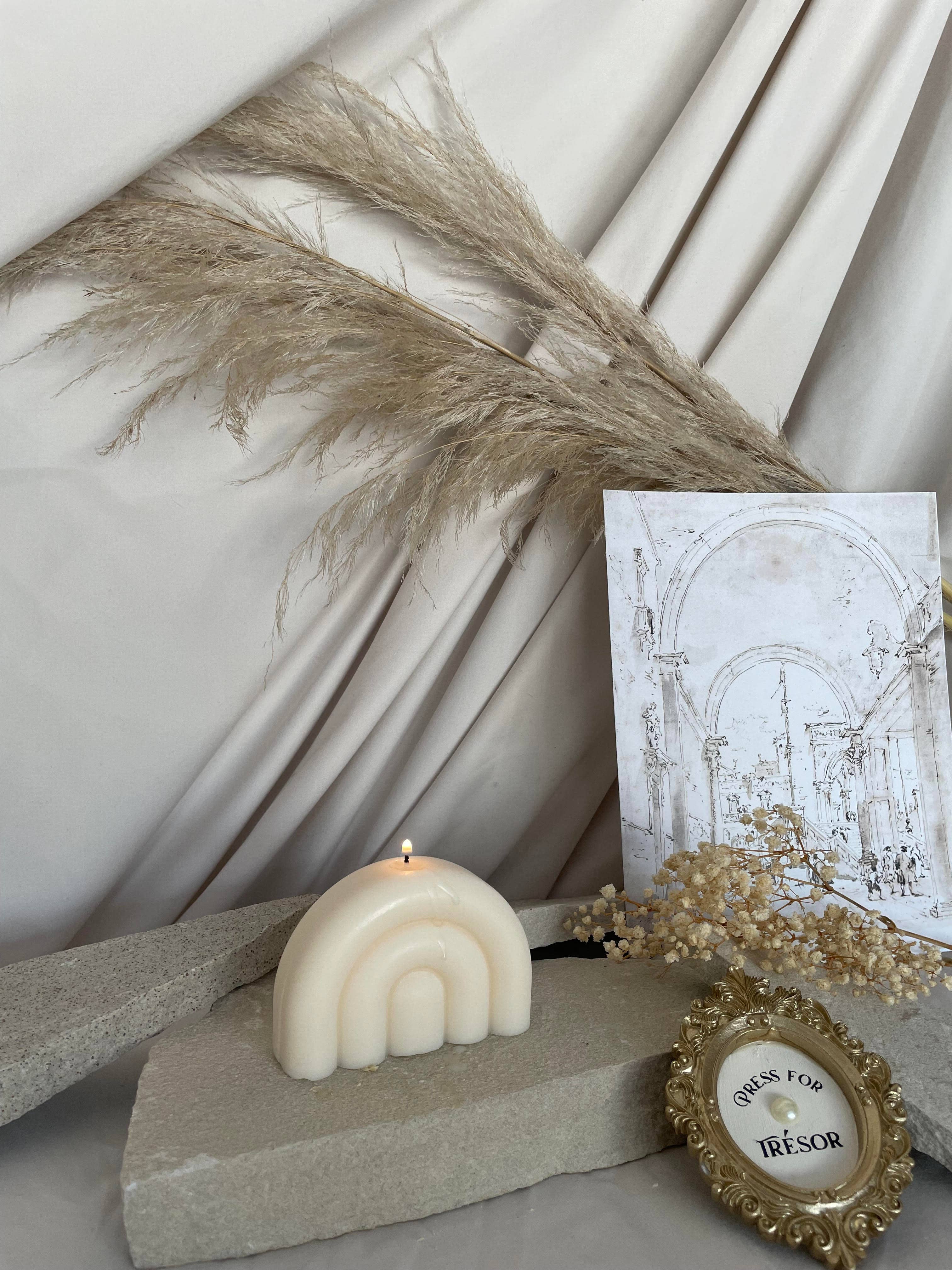 The Parisian Arch celebrates the famous 'arch' architecture found in many French monuments. Hand crafted in house in San Francisco, CA. The Parisian Arch makes a concrete statement in three exquisite colors, crème, café and rust. The Parisian Arch is the key to elevating your candle aesthetic, bring an experience to any corner of your home. Dimensions Height - 4 in / 10.16 cm Width - 4 in / 10.16 cm