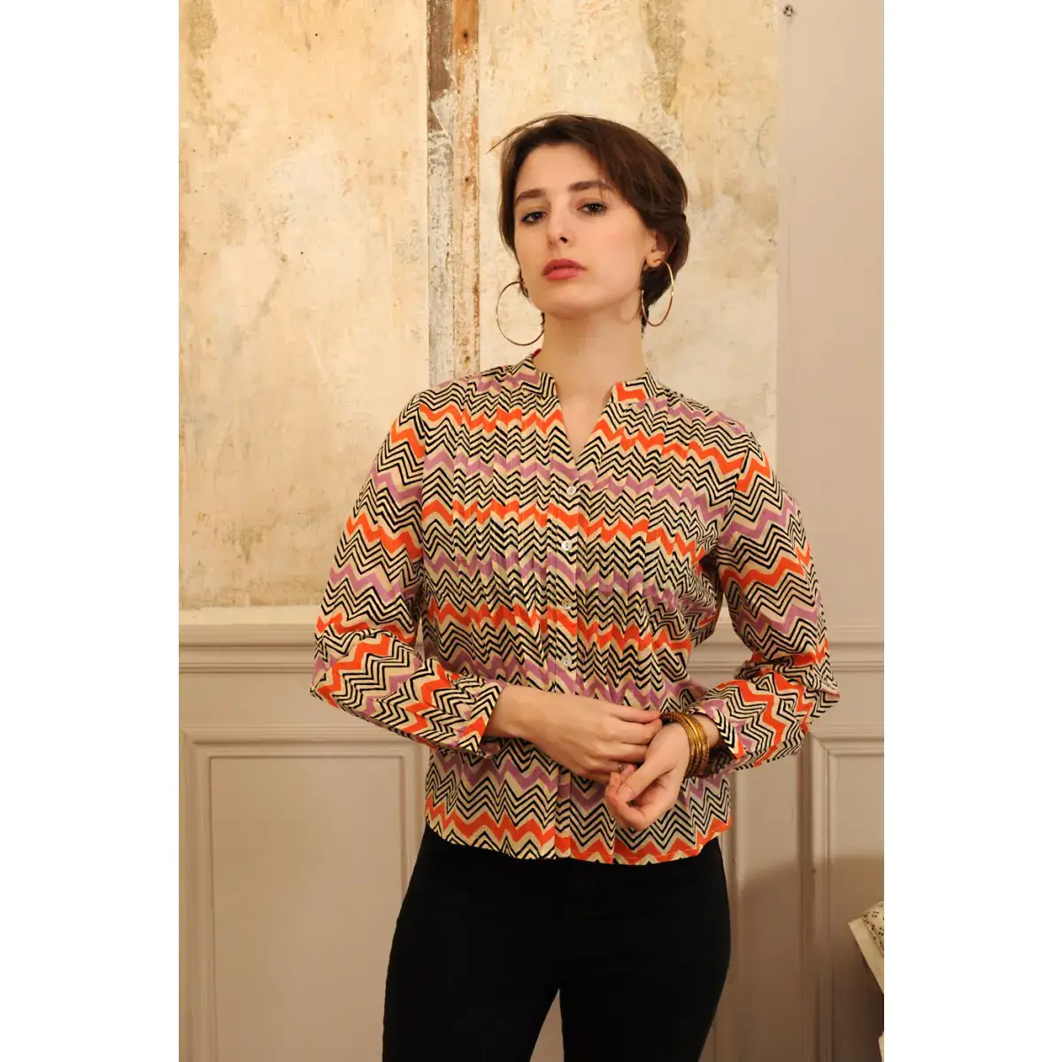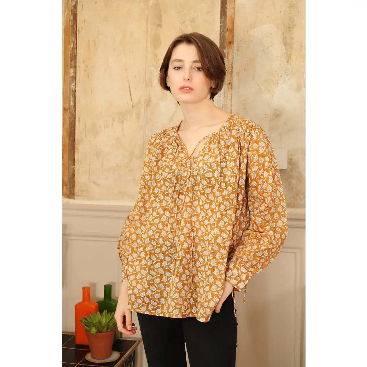 Rosana printed cotton voile short sleeve top in block print The model is 165cm tall and wears a size S/M 100% cotton Available in two sizes: S/M and L/XL Slate color with Corn and Aqua Green floral patterns. Made With Love - Handmade B A O B A B supports many small artisans by offering ever-renewing collections. We carry and participate in the preservation of unique craftsmanship. Owning a BAOBAB product means treating yourself to a product created between La Rochelle and Paris, made in India, often with small family units with whom we have been collaborating since 2004. Slight variations or imperfections may exist. Guarantees of authenticity and quality.