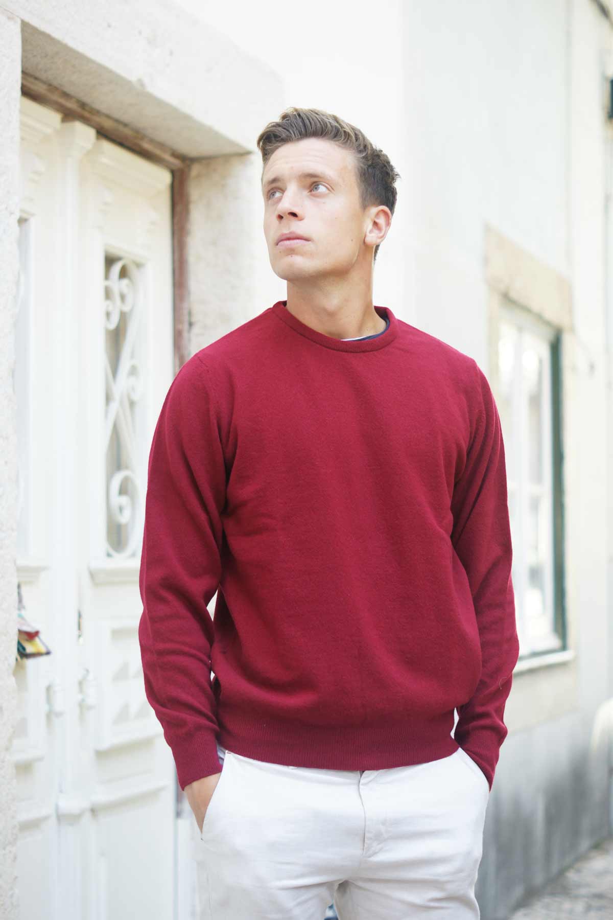 Men´s lambswool sweater with a round neckline. Mesh with testure on the front and ribbed finishe Model- 1.88cm - size XL