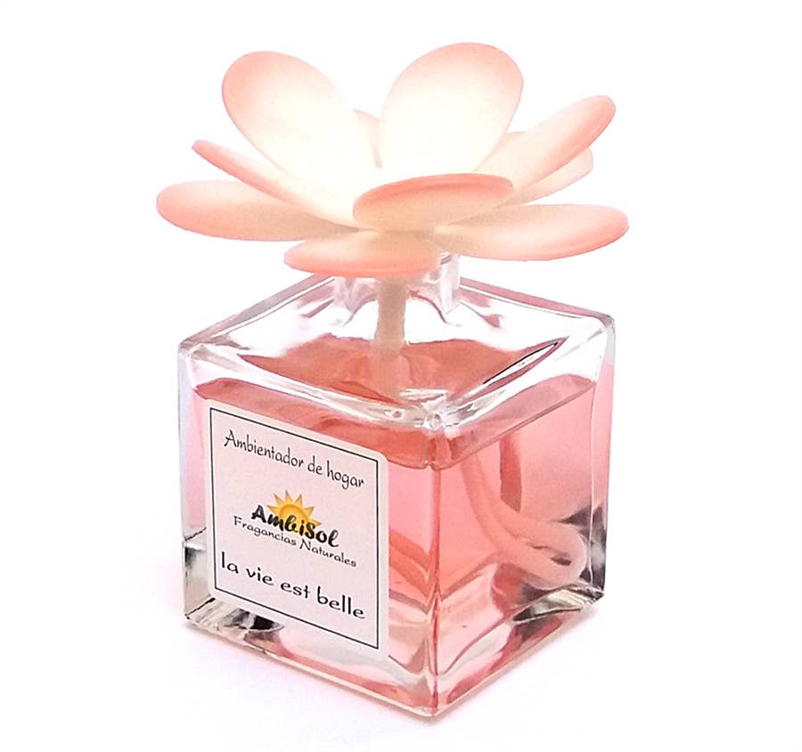 Home air freshener with scent diffuser flower. Presentation: 100 ml bottle in a transparent box. The AmbiSol Flower Air Freshener is the ideal complement to decorate and perfume your home or workplace. The diffusing flower is impregnated with the aroma and diffuses it into the environment without altering its properties. You just have to insert the cord into the bottle and in a few moments you will begin to enjoy the aroma, and the flower will fill with color as the days go by. Available scents: orange blossom, rose bath, cinnamon-orange, cinnamon-vanilla, lemongrass, lady of night, white flowers, red berries, jasmine, la vie est belle, lavender, lilacs, mango, divine nero, scent of clean, pine, angelica root, rose, sandalwood, vanilla. For new customers, it is allowed to order 6 units per scent, but it is necessary to complete boxes of 12 units, for example: (6 red fruits+6 jasmine), (6 lavender+6 cinnamon/orange), etc...