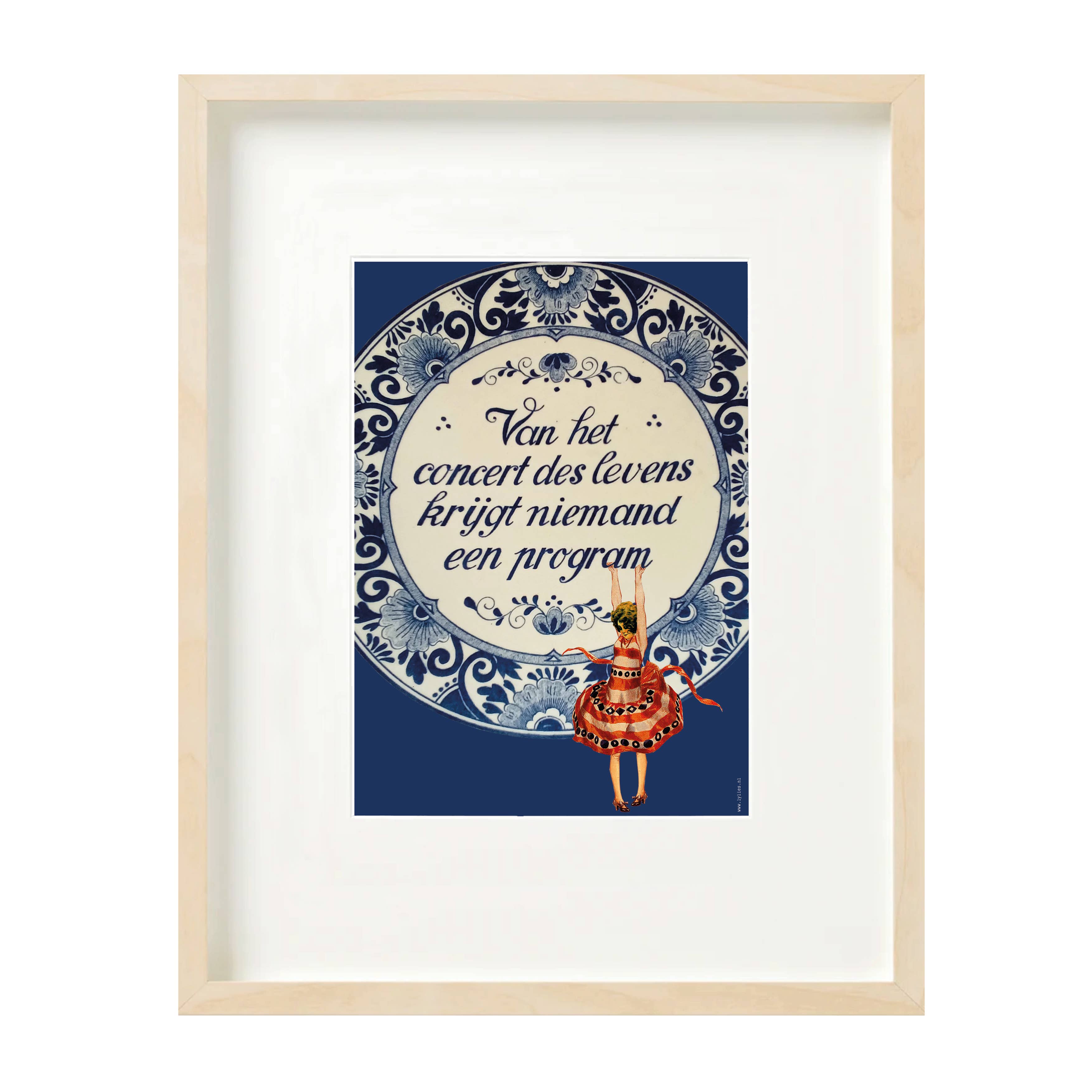Cheerful print with a collage. Made on 350 gram Tintoretto Gesso paper in A4 format. 29.7 x 21 cm, 8.3 x 11.7 inches. Tintoretto Gesso is an uncoated type of paper with a nice structure that is reminiscent of watercolor paper. The paper is slightly off-white. The structure remains visible in the image and has a classic look. Equipped with reinforced cellophane cardboard.