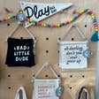 In This House (Black) Banner Cherrypick fabric banners are an easy and playful way to decorate with minimal effort! Whether decorating for a special occasion or simply just for fun, our banners add a unique and magical touch. Customers love our banners because they are: * Professionally printed in small batches with non-toxic ink on durable and lightweight polyester fabric * Water and mildew resistant * Machine-washable and easy to clean * Easy to hang and re-use over and over * Perfect for playroom, nursery, and kids wall decor! RETAIL-READY: Cherrypick’s signature fabric banners ship in retail-ready packaging including a hanger hole for easy merchandising! Each banner includes mounting putty for easy, damage-free hanging! SHIPPING: We ship orders to Canada from Toronto, Ontario and orders to the US and International from our warehouse in Niagara Falls, NY for a seamless, duty-free shopping experience across North America.