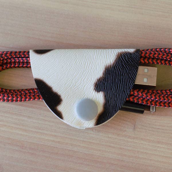 Tired of battling tangled cords? So were we. These faux leather cord keepers are perfect for keeping all your cords - like earbuds, phone chargers, USB cables, laptop cords, or other cords organized and not a giant tangled mess. The snap makes using and storing your cables oh so easy. This cord keeper is made from one of the deadstock fabrics we've picked up on our journeys.