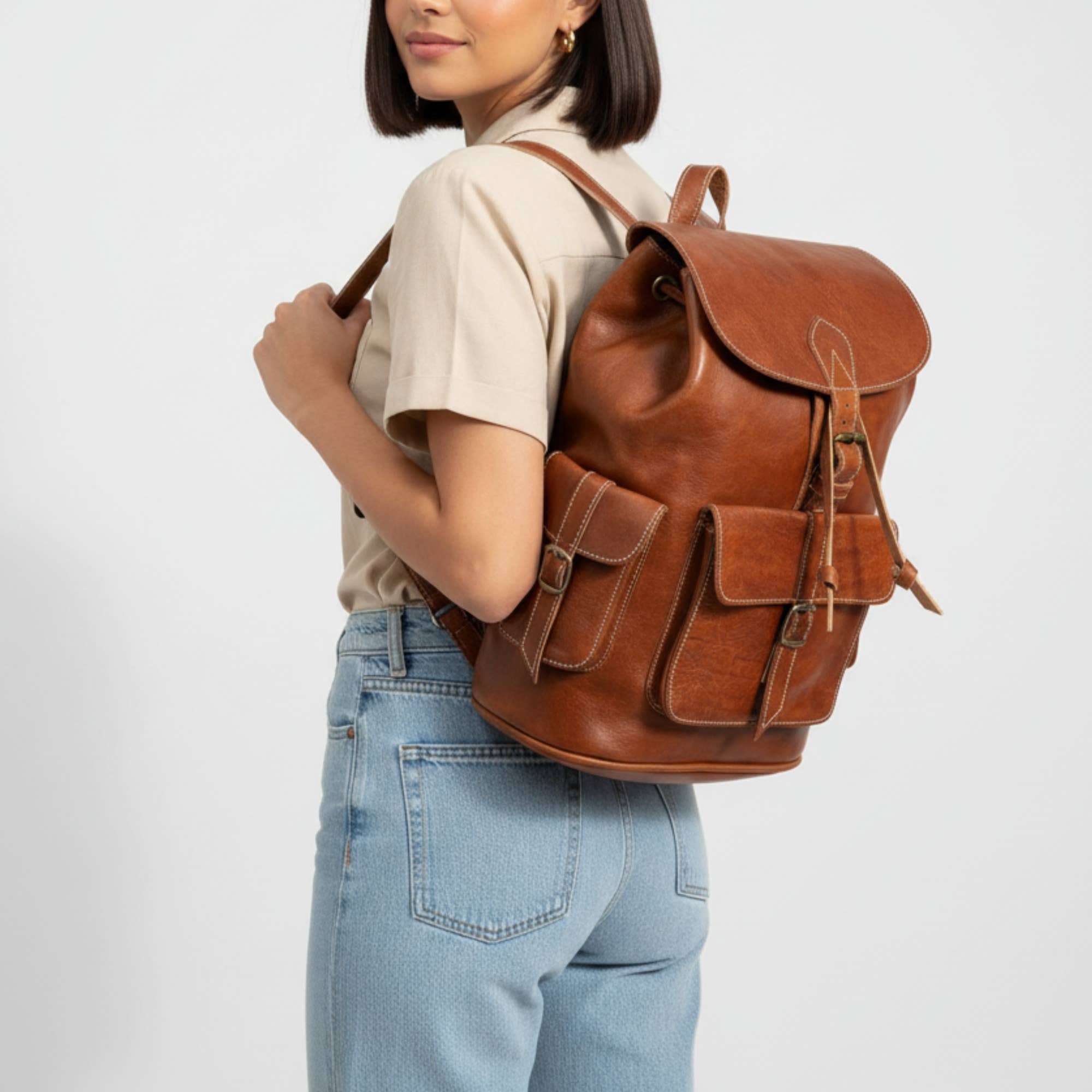 A compact satchel-style leather crossbody with organized exterior pockets, a zip-top main compartment, and an adjustable strap—built for everyday carry and travel while staying lightweight and structured. Real leather. 9.8" W × 6.3" H × 2.4" D (25 × 16 × 6 cm). Multi-pocket front with buckle tabs + side pocket Zip-top main compartment (double zipper) for secure storage Interior lining with small organizer pocket Adjustable crossbody strap for a comfortable fit Compact but roomy: phone, small wallet, sunglasses, keys Colors: Brown, Dark Brown, Cognac Care: occasional leather cream to condition