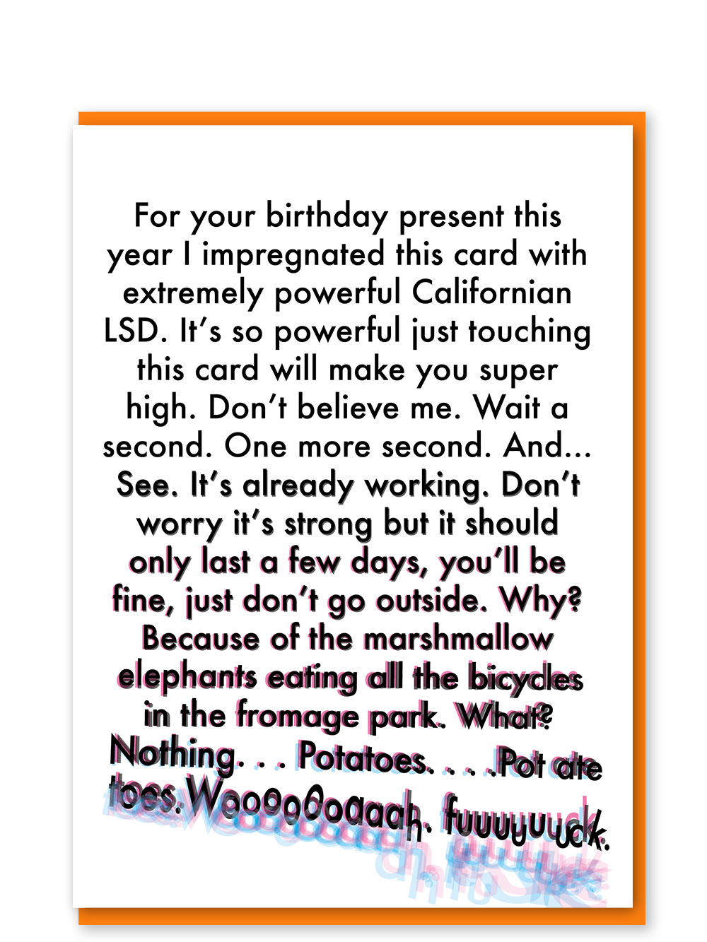 120mm x 170mm greeting card. Printed in the UK on FSC certified 350gsm Callisto Soft white card. Coloured envelopes. Naked and nested unless cello requested.