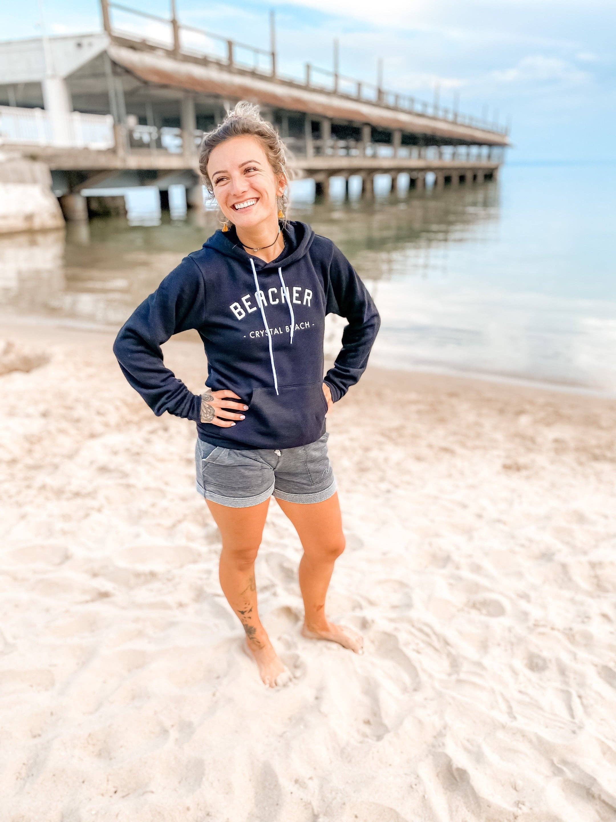 This heavyweight, cozy pullover hoody is bound to be your new favourite layering piece. Designed and crafted by talented artisans, this Deluxe Hoody boasts little details that make a big difference. Decorated with our original sandy bum club design. This forever hoodie will age as beautifully as you will. * 100% Cotton * 20oz Brushed Back Fleece * 4 Needle Flat-Lock Stitching and Bar-Tacked Kangaroo Pocket for Increased Durability * Durable 2x1 Rib Cuffs and Waistband * Matching Round Drawstring * Garment Washed and Pre-Shrunk * California Proposition 65 Compliant * Designed and Decorated by Planks Canada in Crystal Beach, ON, Canada * Sewn in Canada * Ethically made Disclaimer: Due to the dye nature of Sand garments, the colour may rub off if in contact with lighter-shade garments and items. Please note that Sand garments should be laundered with like-colours before wear and worn separately or with similar shade tor best manageable expectations.