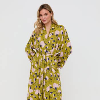 This women's sage green robe is the perfect addition to any wardrobe. Its kimono sleeves and reversible printed belt with intricate pattern make it both fashionable and practical. Lounge in style both at home and on vacation with this must-have piece. * Kimono Sleeve robe * Reversible belt * Long robe style * 100% Organic Cotton Model is wearing one size.