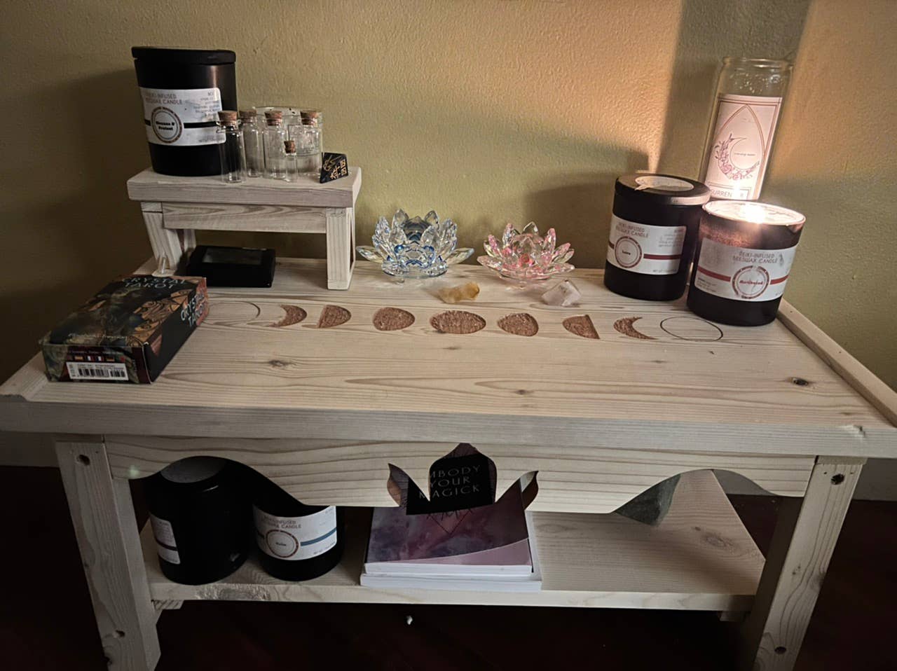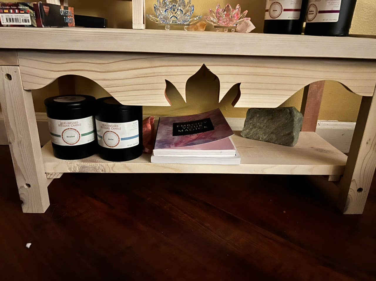 Lotus of the moon's meditation altars are handcrafted from cedarwood and created with intention to enhance your spiritual practice, or as a beautiful centerpiece to honor that which you love. All tables fold at the legs and center bars for easy storage and transportation. The triangles in the legs of the altar represent the balance created by shiva and shakti, the male and female aspects of god. The lotus carved into the stretchers represent or wishes for you to remain fully grounded in mother earth, yet always aspire toward the divine. This design is the raven, which encourages us to dive deep and to look within to seek the answers to put in motion a much-needed change. This is a larger version of our standard altar, with a removable shelf below and pedestal top. Table: 24" long, 12" wide, 12" tall (4" tall when folded), 16" tall with pedestal pedestal: 7. 5" Long, 3.5" Wide, 3.5" tall.