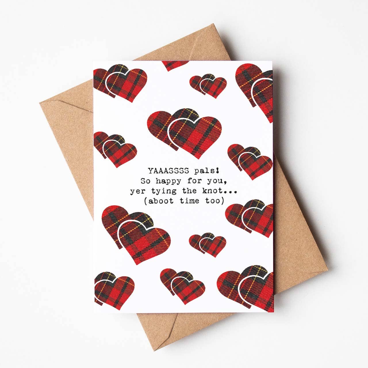 'Another year's come aroon but dinnae be upset, jist gie it laldy anyhoo, an mind yer no deid yet!' With the perfect Scottish humour in this tartan birthday card, ye remind the recipient they might be old but they aren't dead...yet. This patterned patter Scottish card design is printed on FSC certified cardstock in the UK. The A6 sized card is blank inside and comes with a brown recycled envelope, for wholesale orders this card is packaged plastic free with simply a sticker seal.