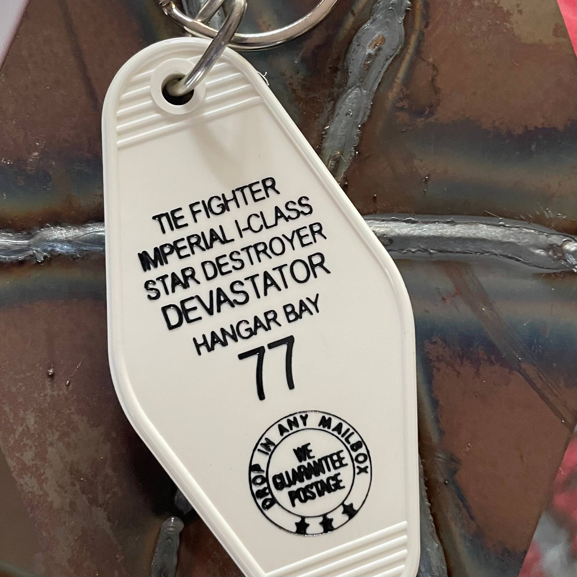 Vintage style motel key fobs, complete with 32 mm slip ring, drive Luke's space rocket from Star Wars. NEWS FLASH!! We are now doing our own in house injection molding for the plastic fob. What that means is this is 100% Made In America, and we have more color options. We have also added an additional ring to the fob so that it hangs flat!