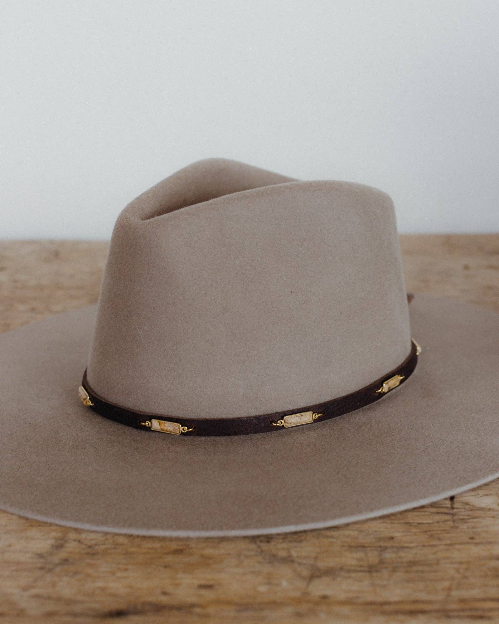 Suggested MSRP $145 The more delicate version of our beaded hat band - the petite beaded hat band features a variety of semi-precious faceted gemstones with leather ties for an adjustable closure to fit any hat. Dimensions: 20" beaded length before leather ties Material: Various Semi-Precious Stones/Beads, Leather Cording Hardware: Gold Plated Jump Rings and Crimp Beads Closure: Leather Ties - brown for all stone options except pyrite, which uses black Stone Options: African Turquoise Turquoise Labradorite Pyrite Rose Quartz Handmade by Crossbow in the mountains of Telluride, CO.