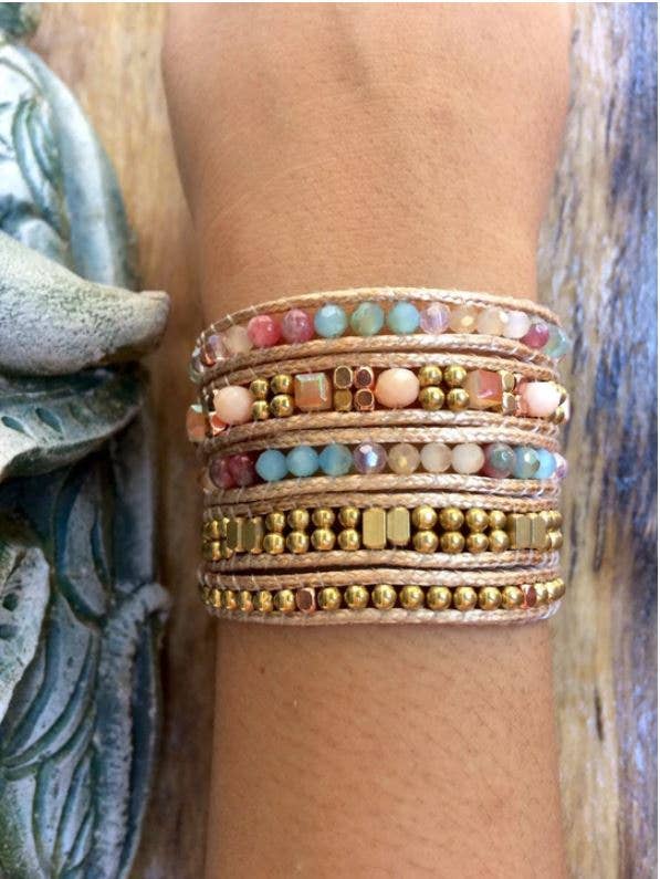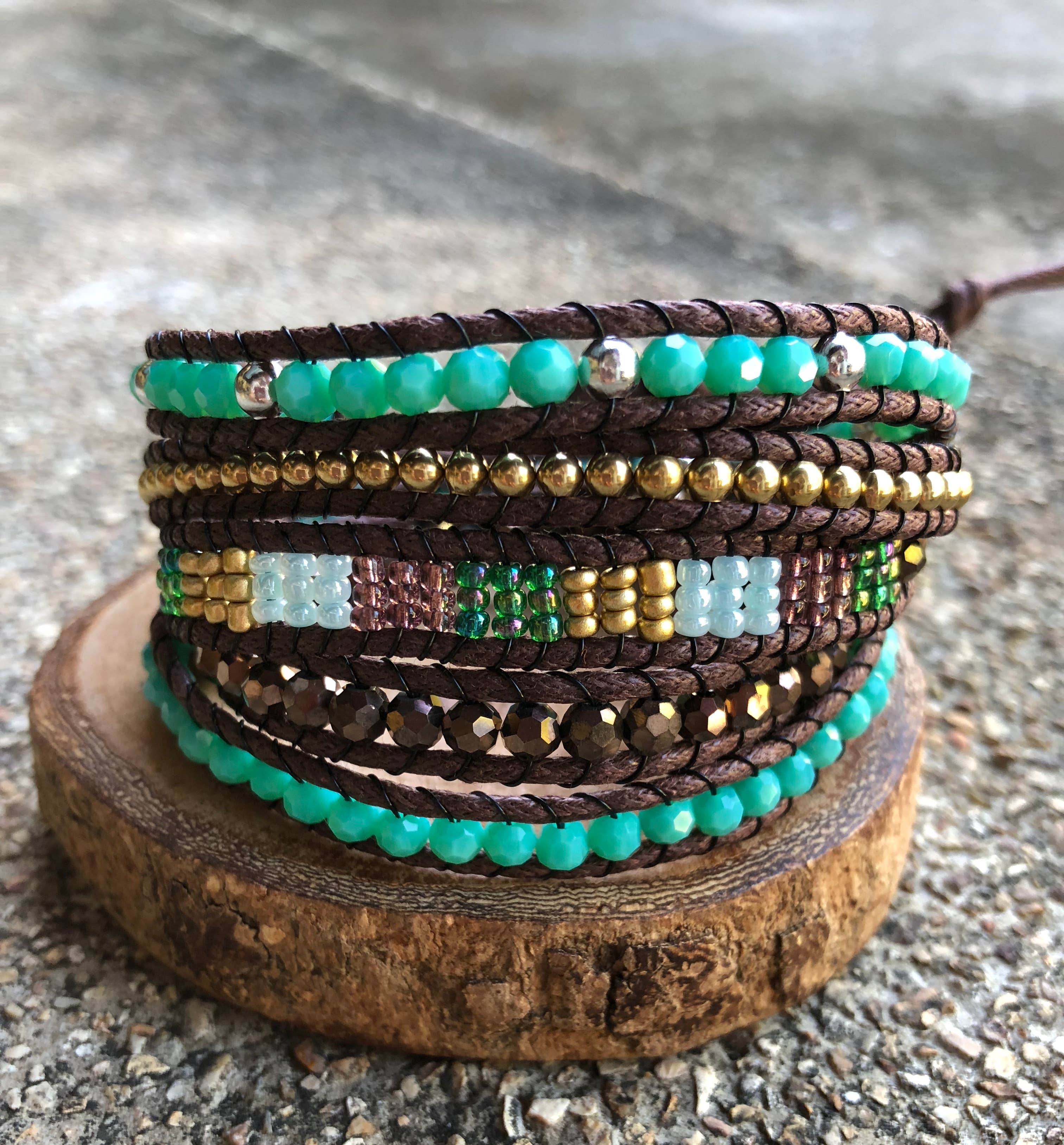 ♥ Turquoise wrap bracelet - Handmade bead woven bracelet ♥ 3 Wrap Boho Bohemian Bracelet ♥ Metal: Alloy ♥ Size: 20 inches + 4 closures for adjustment ♥ Material: Multi Stone, Leather ♥ Handmade With Love and Unique design ♥ For additional adjustable if no need, simply cut them off for a perfect look >>>>>>>>>>>>>>>>>♥♥<<<<<<<<<<<<<<<<<<<< At SoulTika, all our jewelry products are Handmade With Love in a small group of communities and many villages in Thailand, that they put an effort into creating amazing products just for you. Each stone has been carefully selected with the best quality. After ordering this handmade wrap bracelet, you will have a unique handmade piece and help working mothers from small villages to earn a living and have a better life.