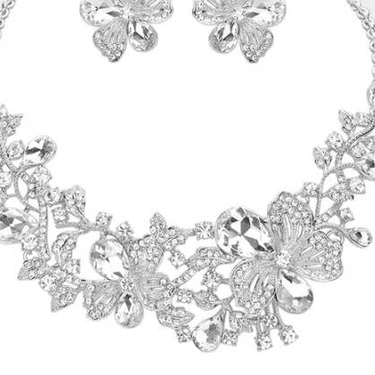 Stone Bead Embellished Leaf Vine Evening Necklace • Necklace Size : 17.5" + 3" L • Decor Size : 2.75" L • Earring Size : 2.3" L Elegant leaf vine evening necklace set with sparkling stone bead embellishments and matching drop earrings. A romantic rose gold-toned statement for weddings, proms, and special events.
